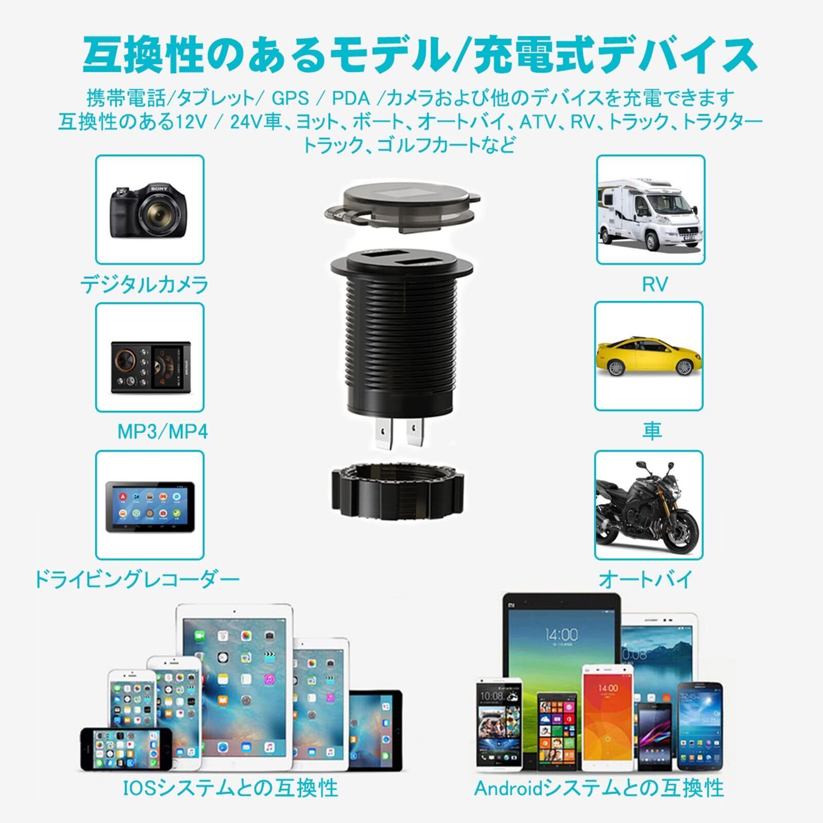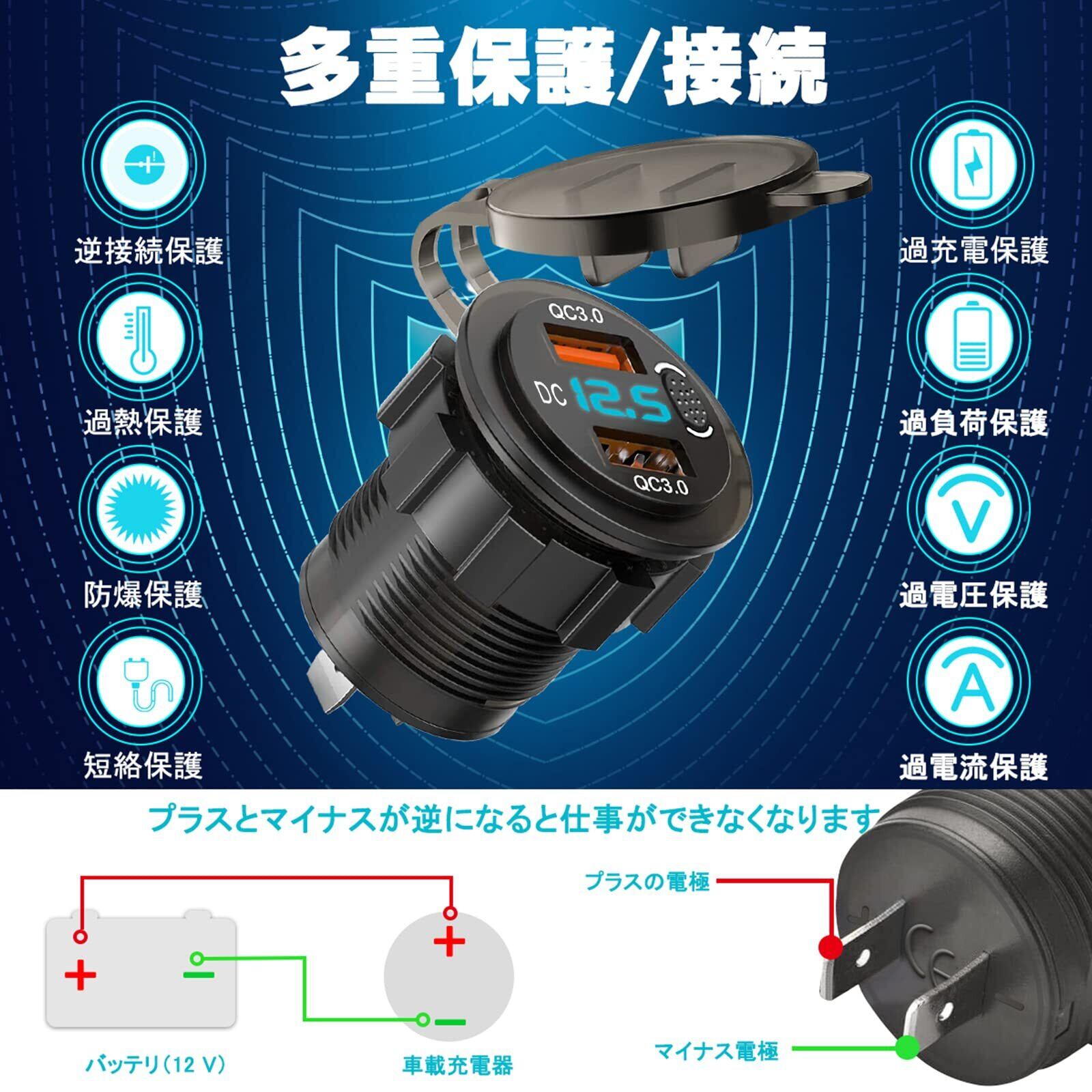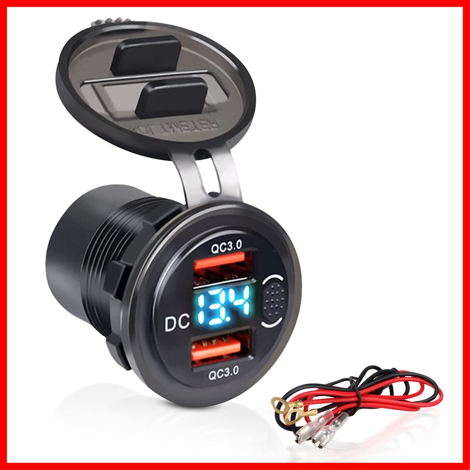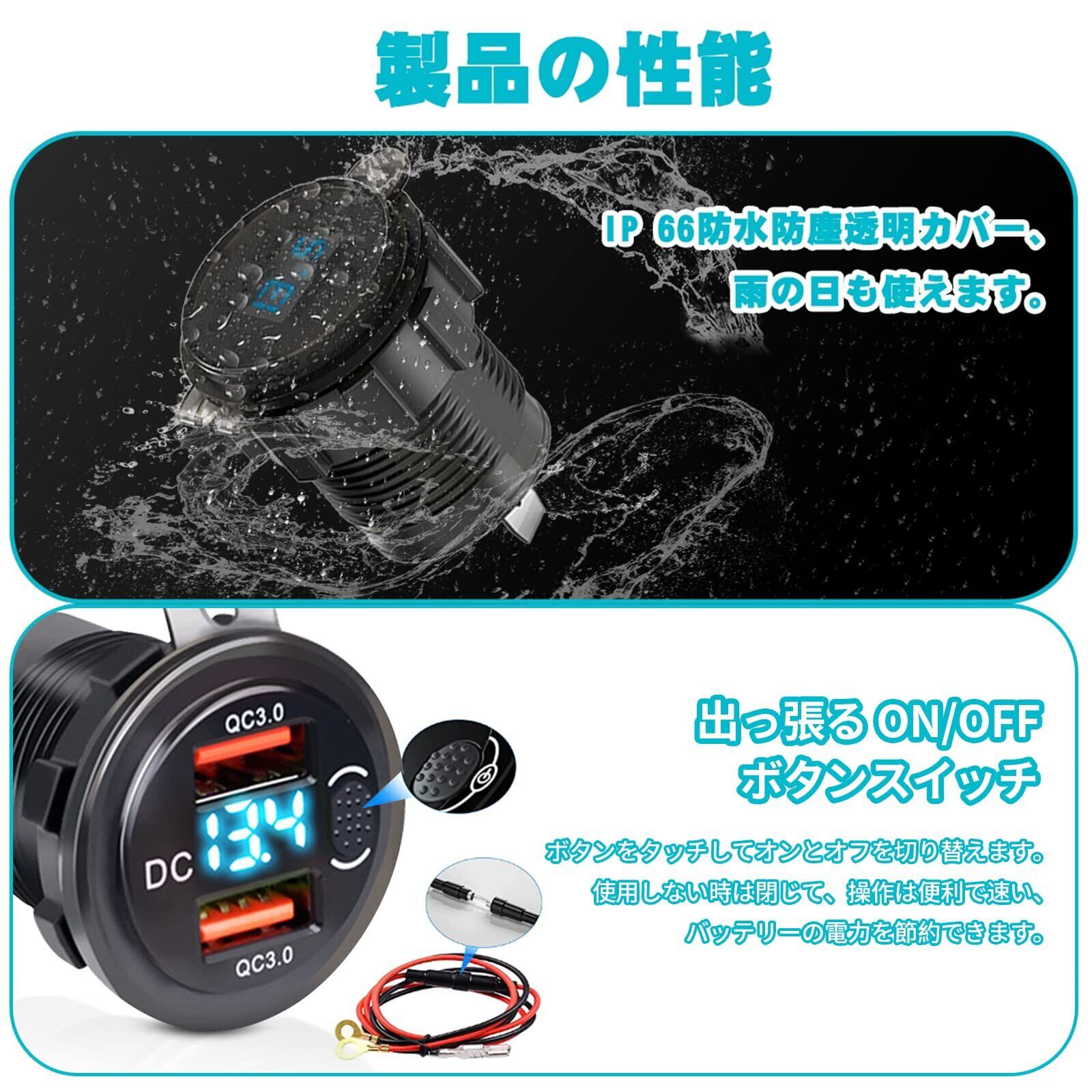 【 IP66防水・防塵設計】ゴムの透明USBカバーによって防水防塵を防いで、内部回路を保護して、その使用寿命を効果的に延長します。USBインターフェース上のタイトフィットキャップに電圧デジタルが表示できます、充電器を効果的に保護します。