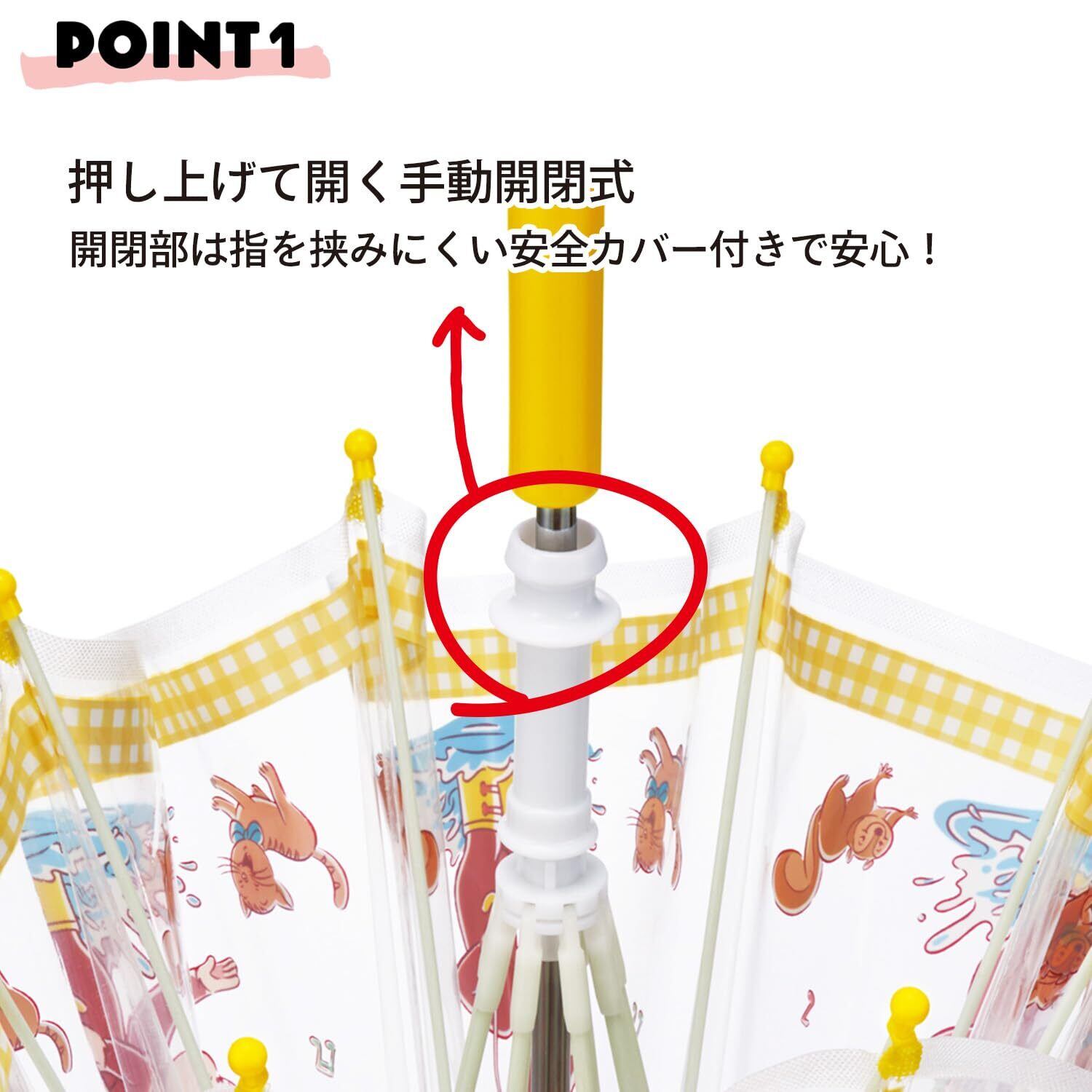 開閉部は指を挟みにくい安全カバー付きで安心