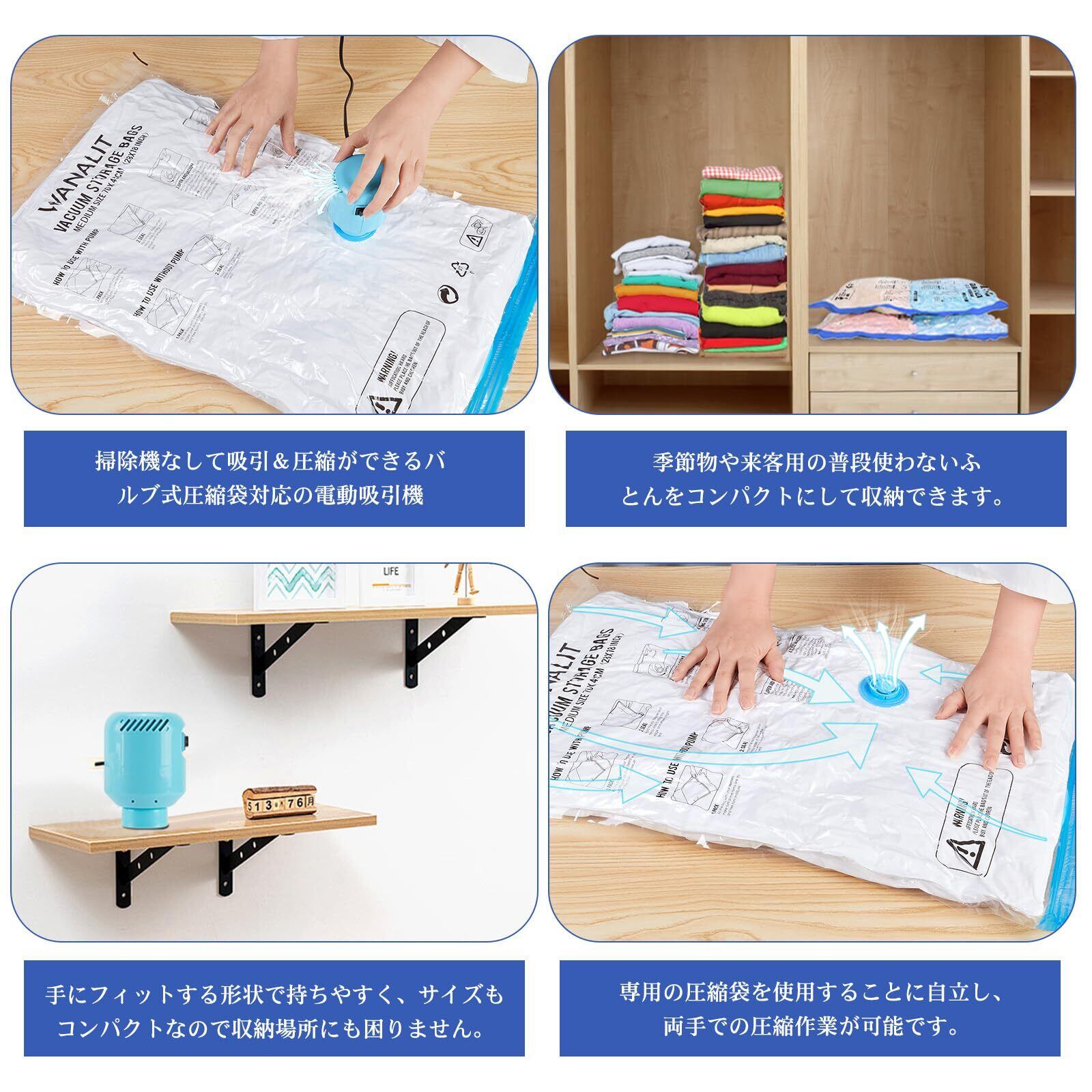 WANALIT 布団圧縮袋 9枚セット 電動ポンプ付き 【100×70cm×3枚/80×56cm×3枚/70×45cm×3枚】 布団/衣類/旅行用 防湿・防塵・防臭