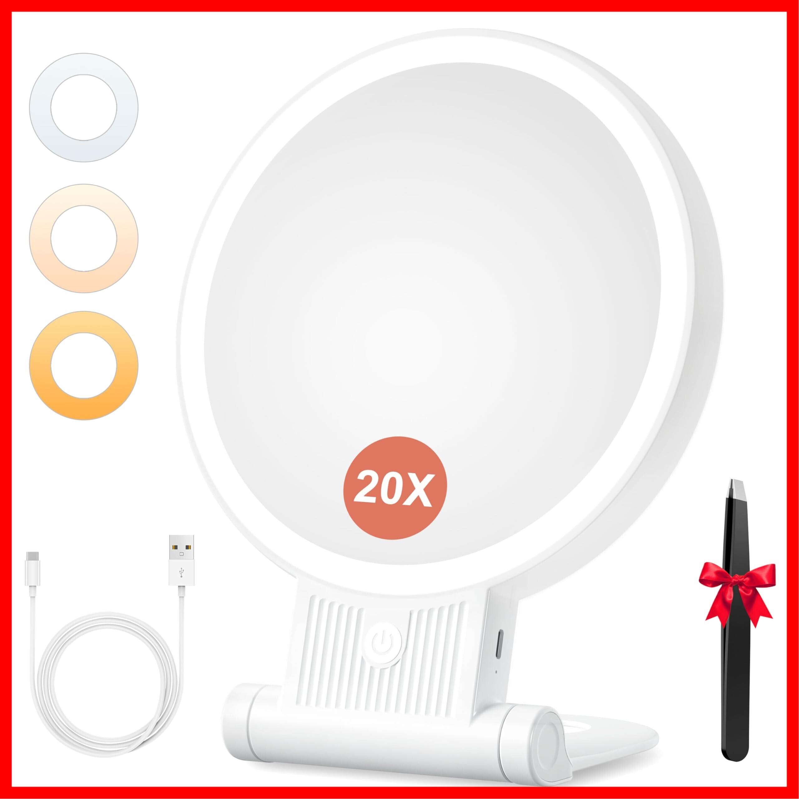 Auxmir 女優ミラー 鏡 卓上 拡大鏡 20倍と等倍 72個LEDライト付き 3光色 折りたたみ式 手鏡 明るさ無段階調光 角度調整可能 USB充電式 2000mAh大容量バッテリー 化粧鏡 ハンド&スタンドミラー 卓上/吊り下げ/手持ち可能 ハンドル付き コンパクト 旅行用 持ち運び便利 円形 ホワイト