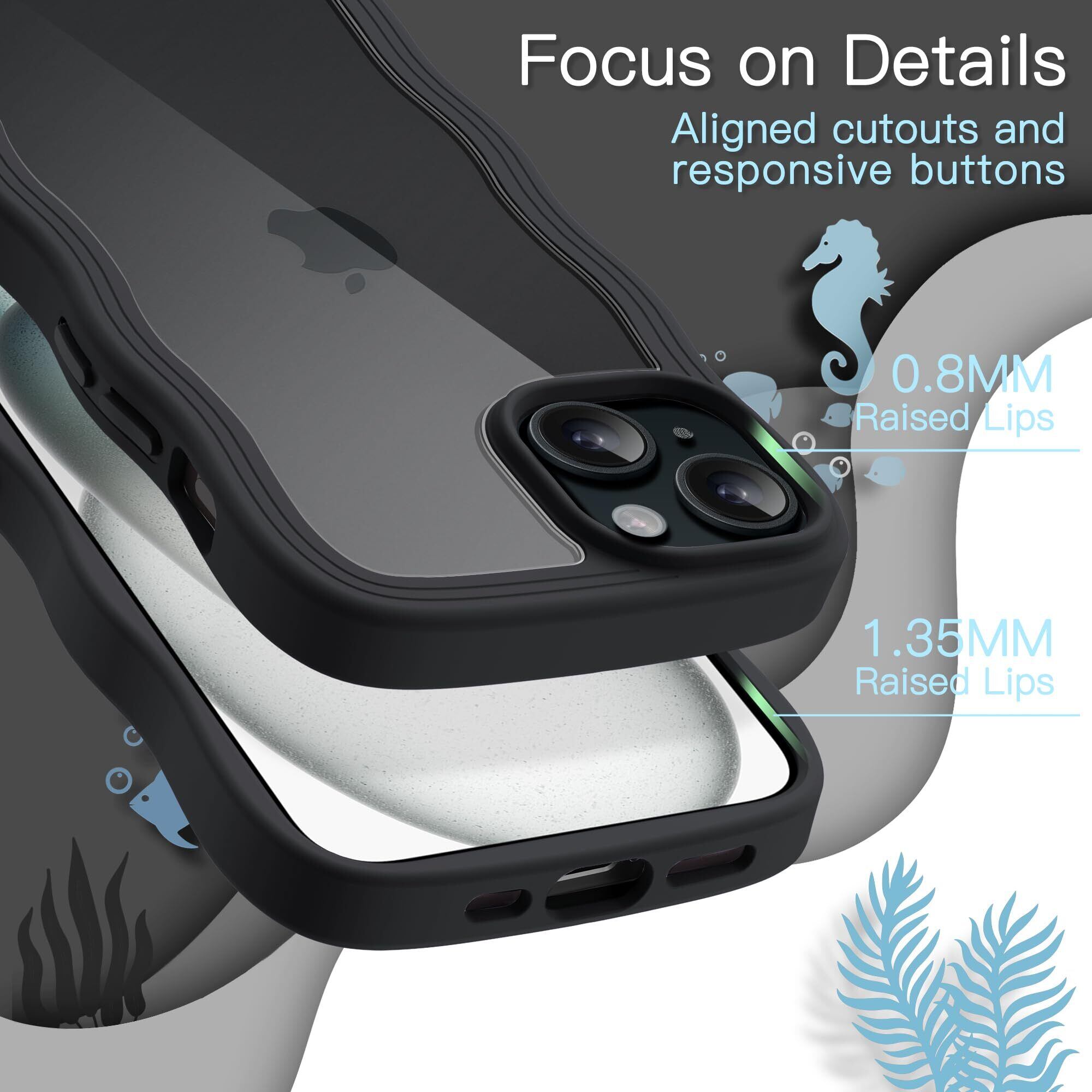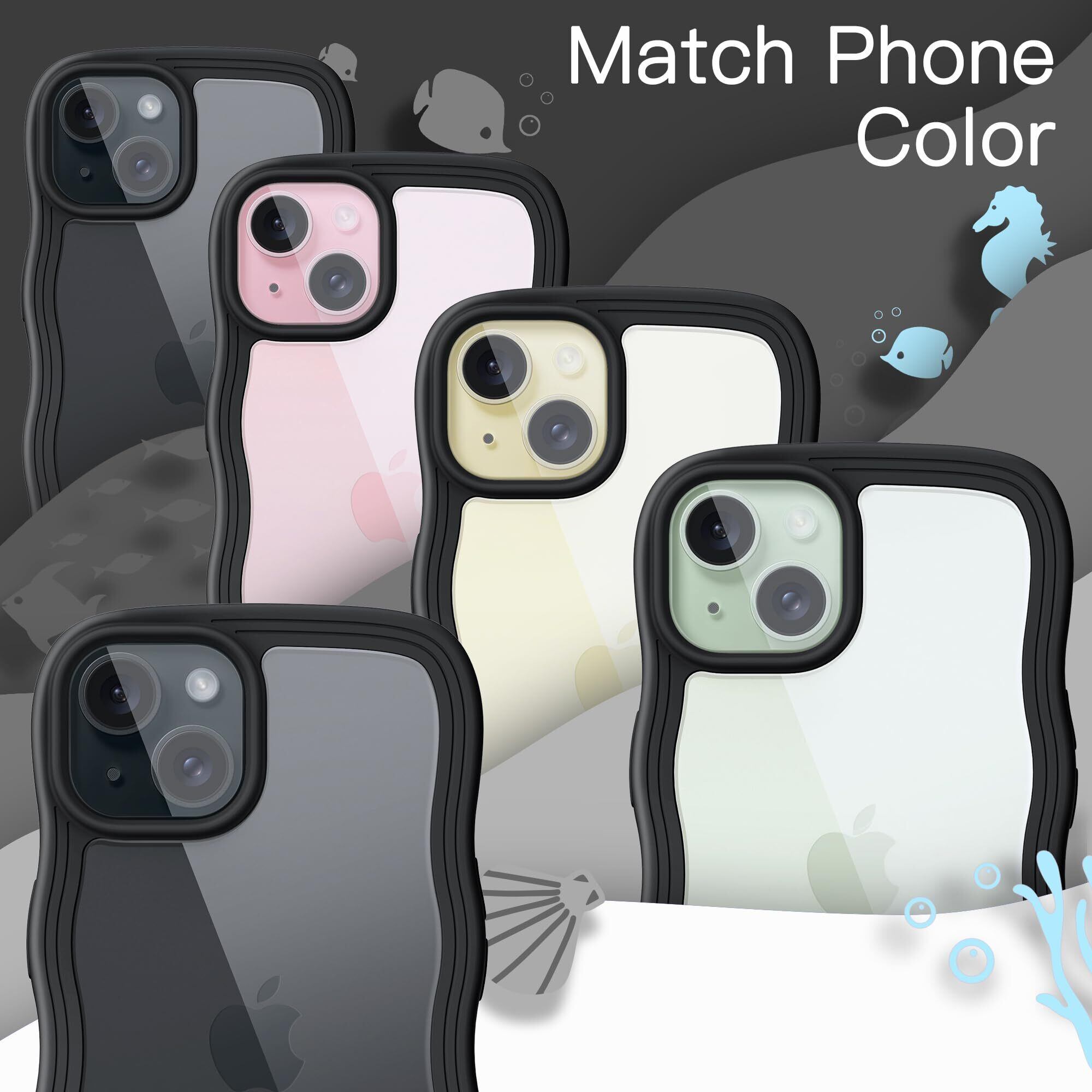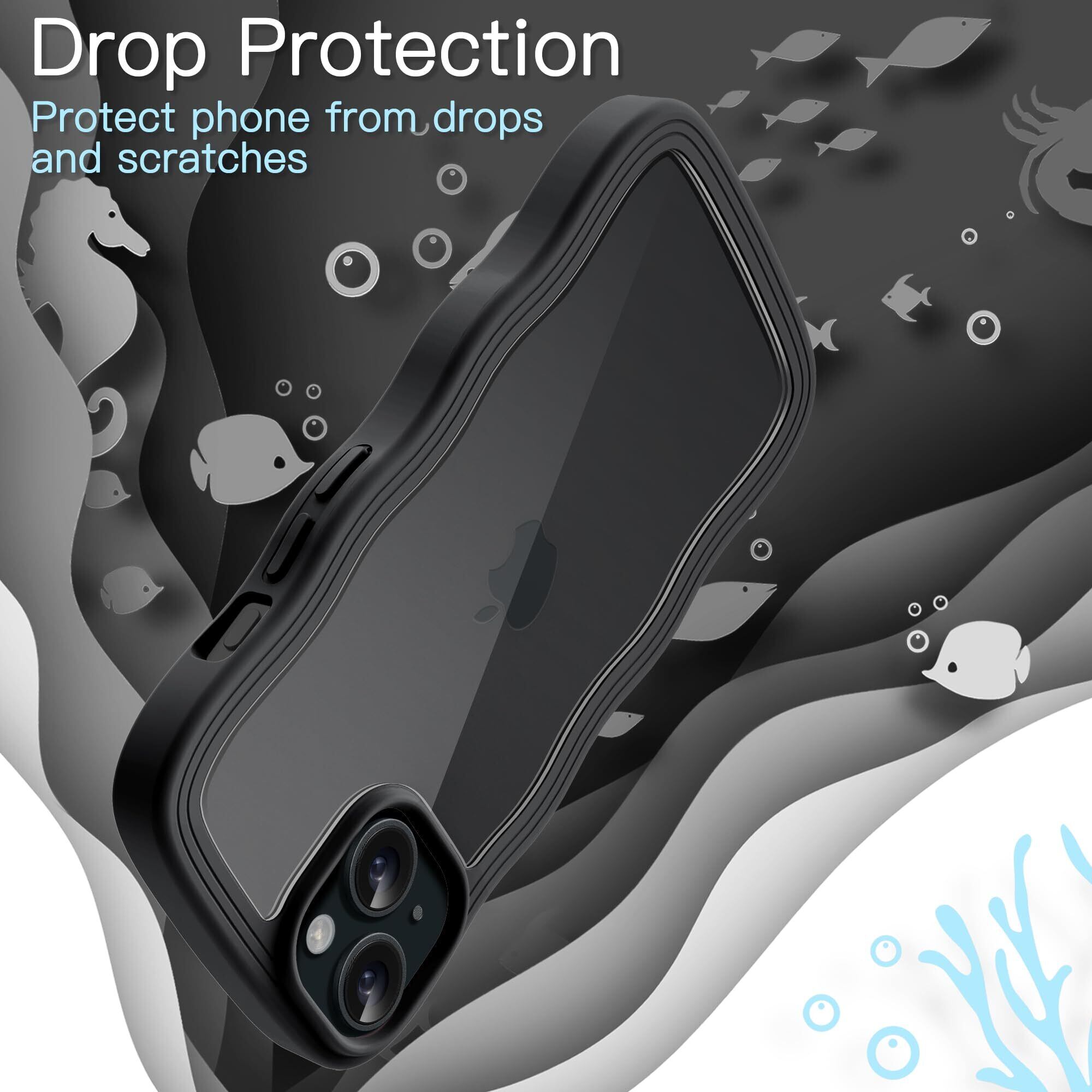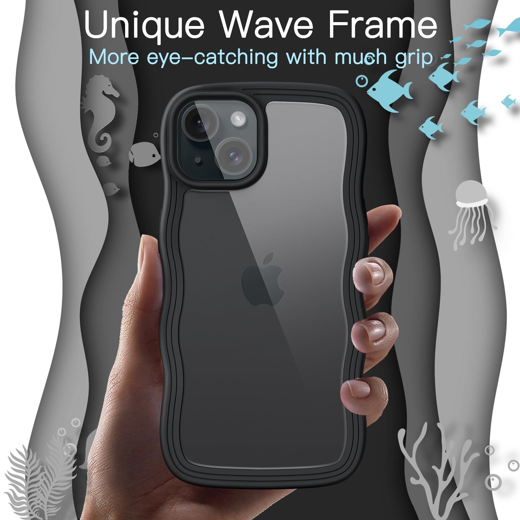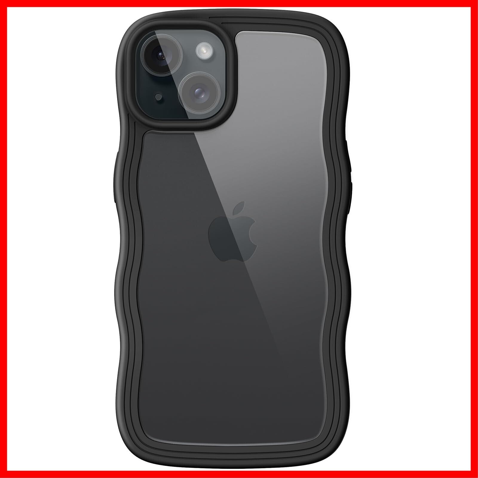 JEDirect iPhone 15 6.1インチ用 かわいい ケース 波状フレーム うねうね 耐衝撃 スマホカバー 女性用 女子向け クリア ハードPCバック (ブラック)