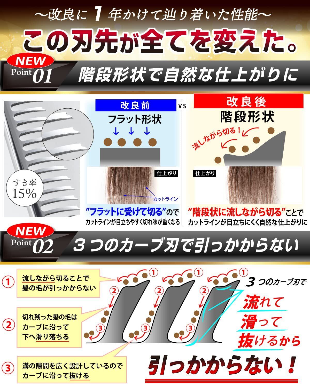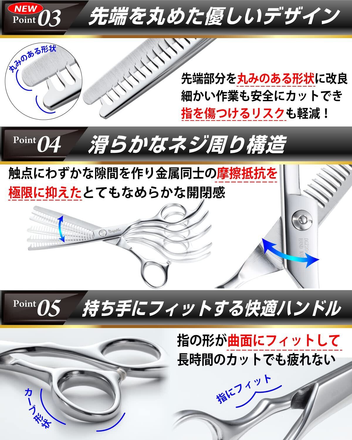 【商品仕様】 一般的なすきバサミはすき率25%以上ですが、こちらはすき率15%。すき率を抑える事によって、切りすぎることなく初心者の方でも失敗するリスクを抑え、自然に仕上げることができます。