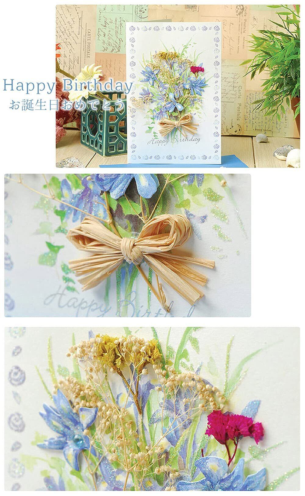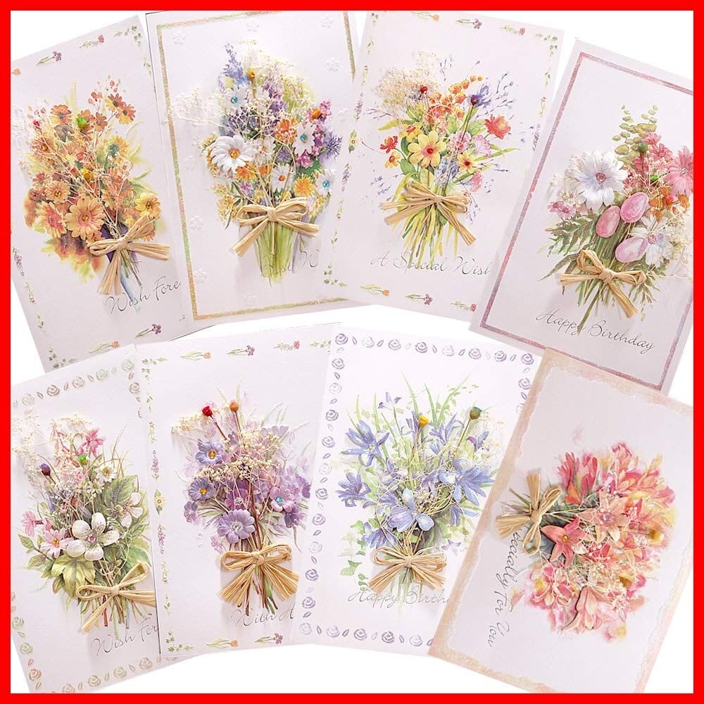 moin moin メッセージ カード カード+中紙+封筒 8種 アソートセット | サンキュー ありがとう 誕生日バースデー グリーディング ドライフラワー 立体 3D リボン 箔押し ゴールド | 花束 花 ひまわり すみれ ガーベラ