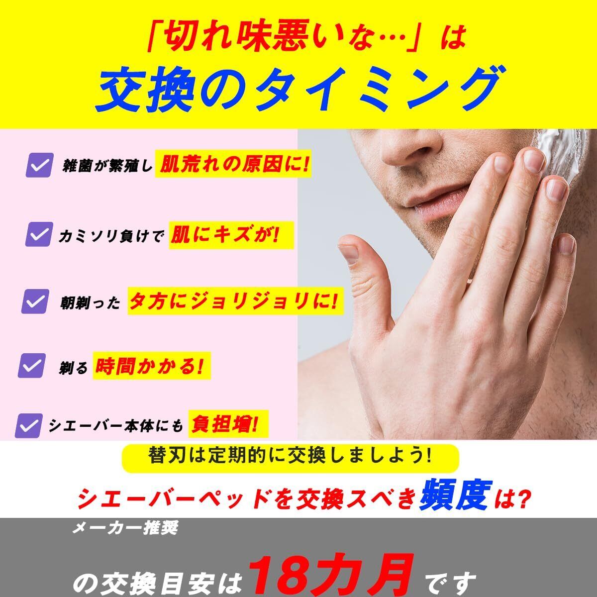 【消耗品&互換品】シェービングの部品は時間を経るにつれて摩耗し、以前より性能の低下を抑えるために、12 ~ 18 か月ごとにシェーバーヘッドはを交換する必要があります。独自のレシプロブレードは、使い始めに慣らし期間があります。 剃りすぎるのは当たり前で、使えば使うほどシャープになります!