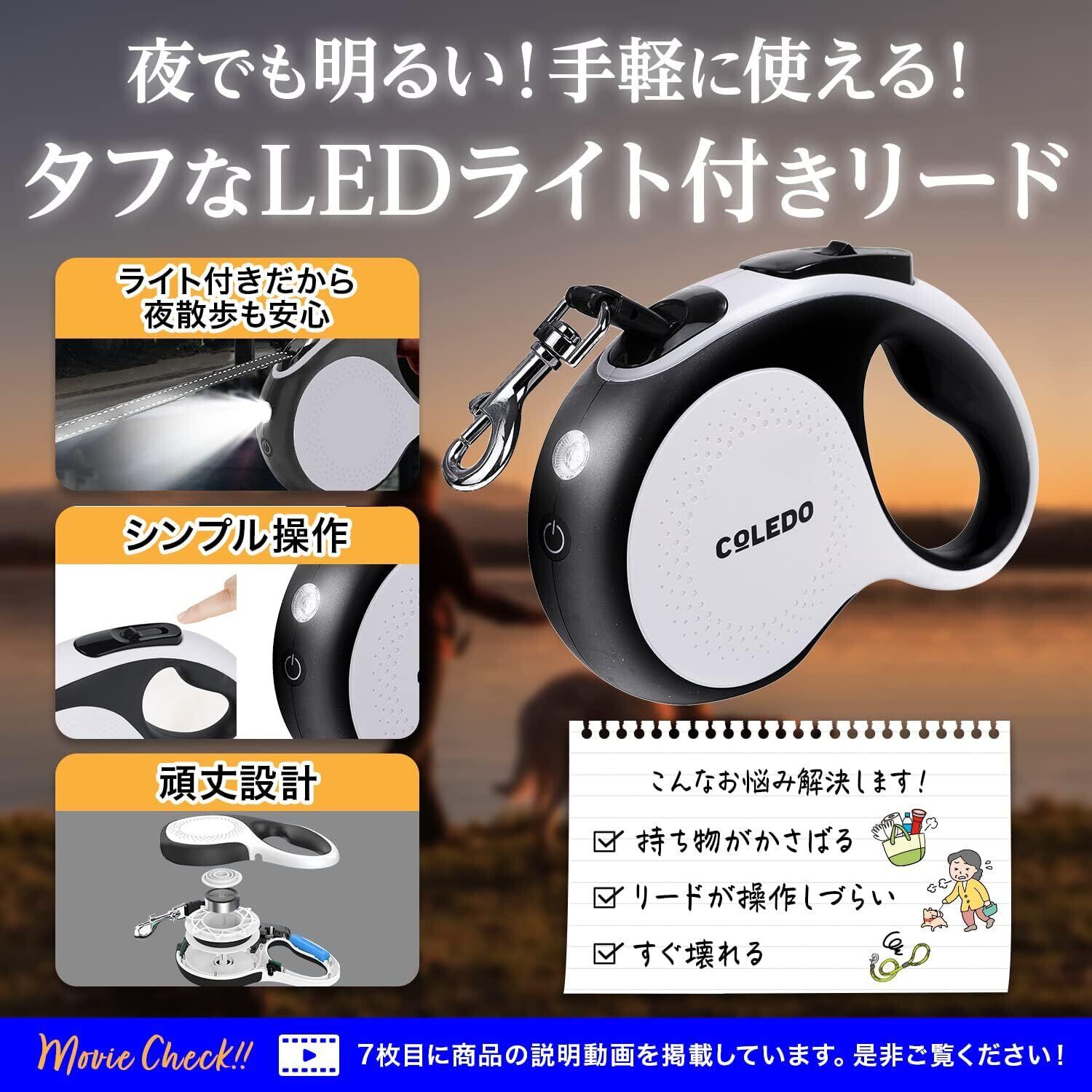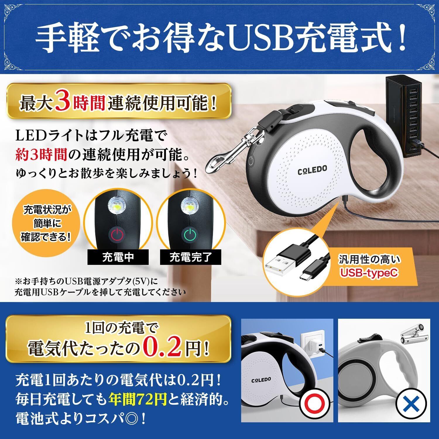 COLEDO 犬 リード 伸縮 【 LED ライト付き 】 USB 充電式 5m 小型犬 中型犬 大型犬 [ 長さ : 5メートル 荷重 : 30kg ] (ホワイト)