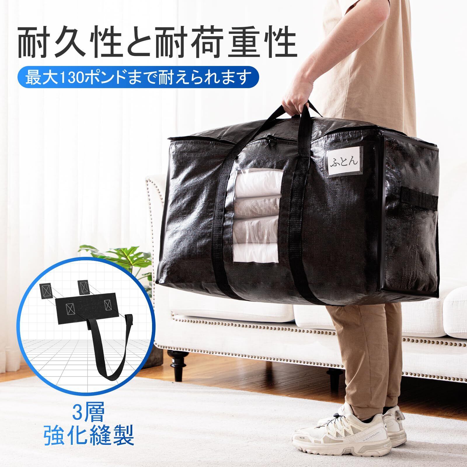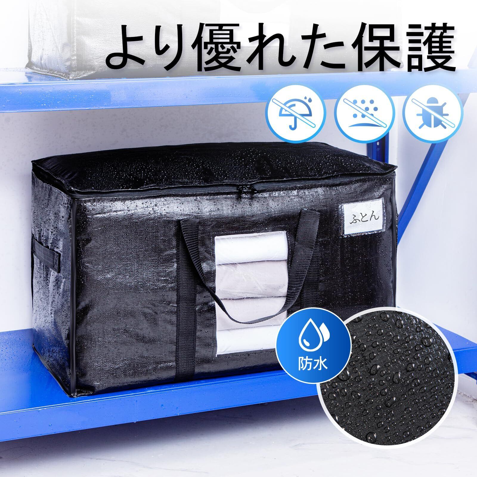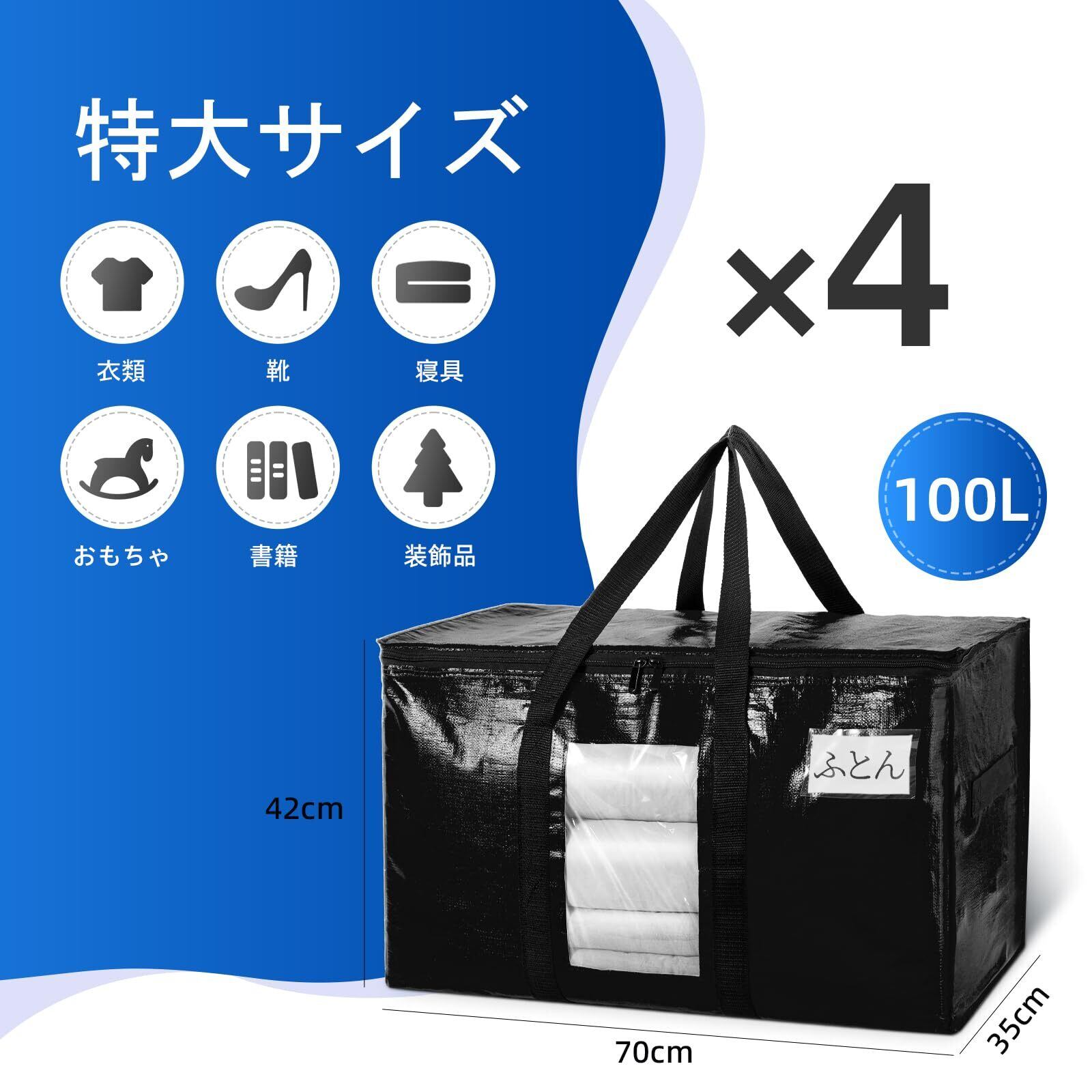 TAILI 大きいバッグ 布団収納袋 引越しバッグ 収納ケース 特大容量 透明窓 持ち手付き 衣装ケース 洋服 羽毛布団 防塵防水 折りたたみ式 カバン 省スペース 引っ越し 背負える キャンプ 旅行 耐荷重 ブラック 4個セット 100L | hananoki
