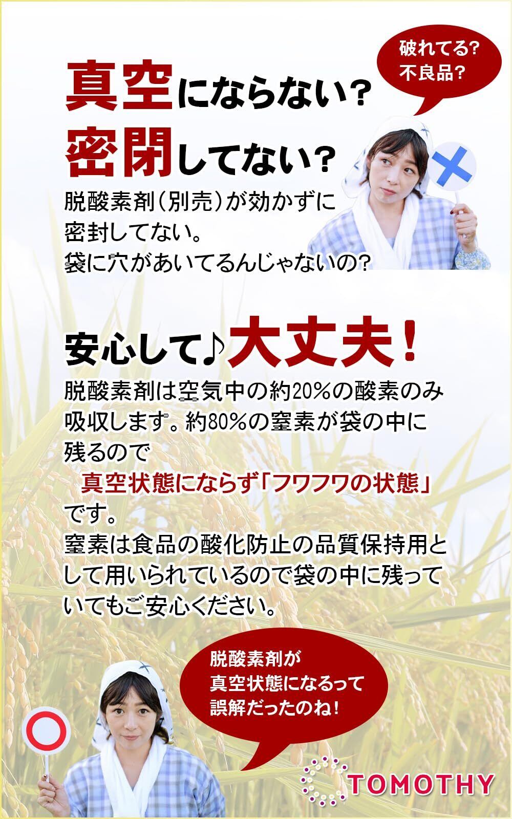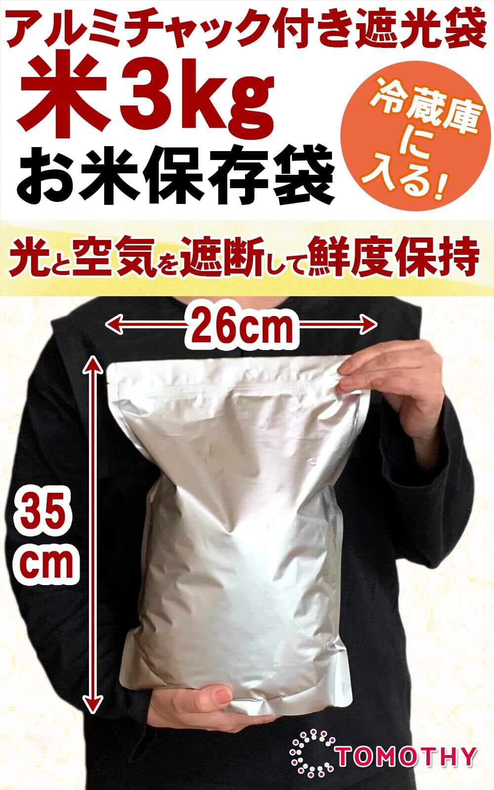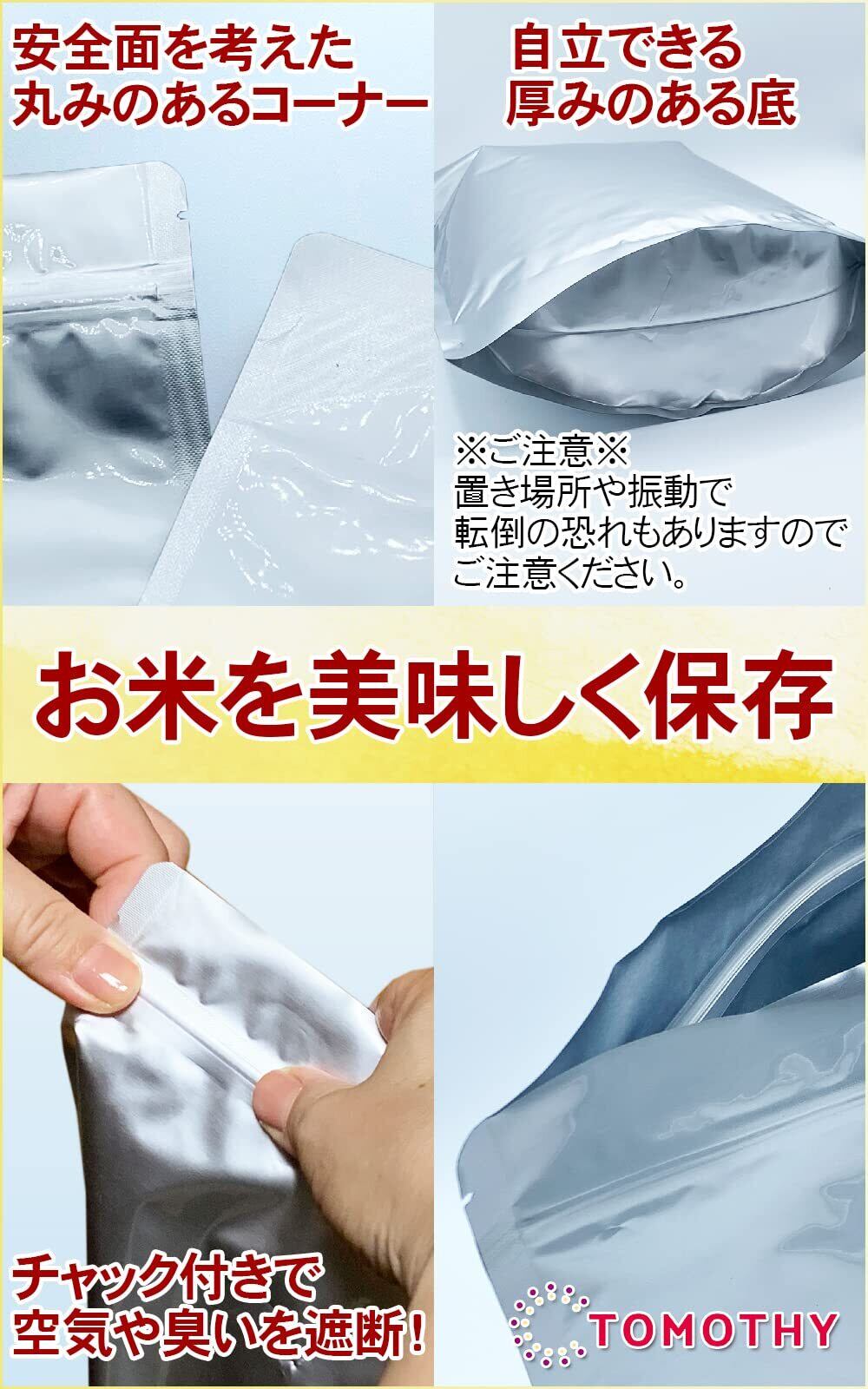 PET、アルミ、PEの三層構造で光、空気、臭いを遮断してお米の劣化を防ぎ、鮮度保持に力を発揮。 白米を美味しく保存できる「TOMOTHYお米保存袋」。 お米を入れて中の空気をできるだけ追い出してからチャック(ジッパー)をきっちり閉めて保管してください。 【お米の保存方法】密閉して涼しい場所、できれば冷蔵庫(野菜室)など涼しい場所で保管するのがおすすめです。 また、直射日光や湿気、水濡れを避けることでカビや虫の発生を避けることができます。 【保存容器はいつも清潔に】お米は臭いが移りやすいので古いお米を残したままの状態で新しいお米を足していくのは良くありません。「お米保存袋」は丸洗いできますのでいつでも清潔を保てます。(ご注意・・・食器洗い乾燥機はご利用できません。) 【ヒートシーラーで長期保存できます】市販の脱酸素剤を封入後、チャック上の部分をヒートシーラーで密封することで酸化を防ぎ、長期間美味しく保存できます。