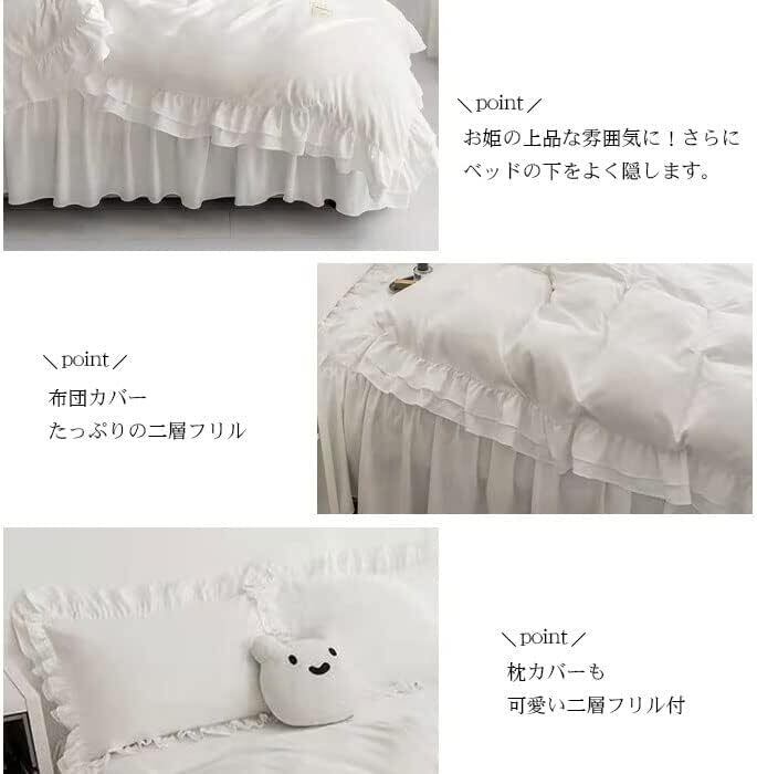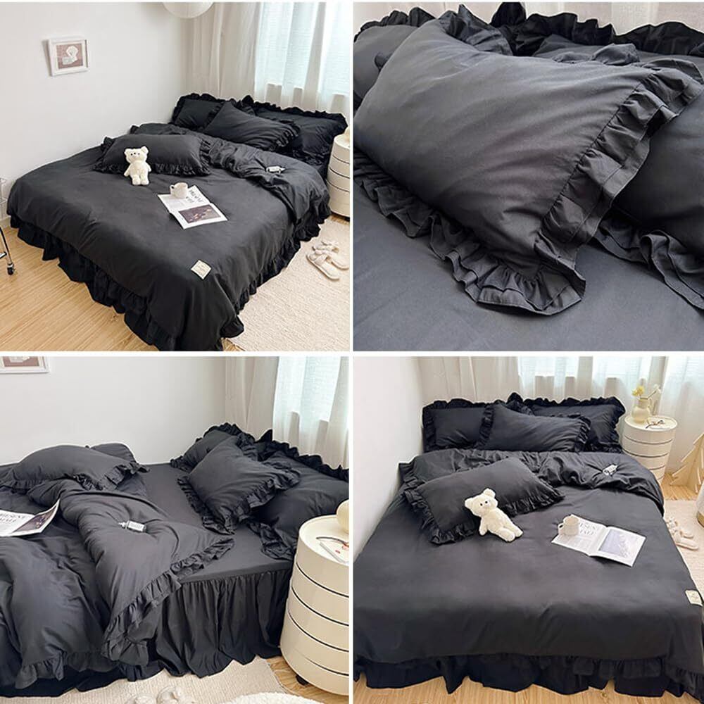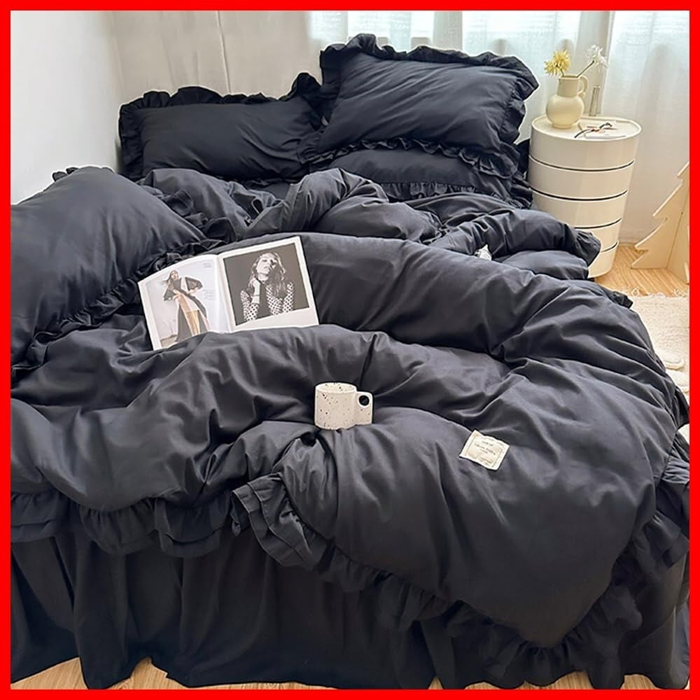布団カバーセット フリル 寝具カバーセット 3点セット 4点セット ベッドカバー 可愛い 洗える 掛け布団カバー ボックスシーツ 枕カバー かわいい 布団かばー アイボリー 洋式・和式兼用 ふとんかばー ふとんカバー しんぐる (ブラック, シングル*3点セット)