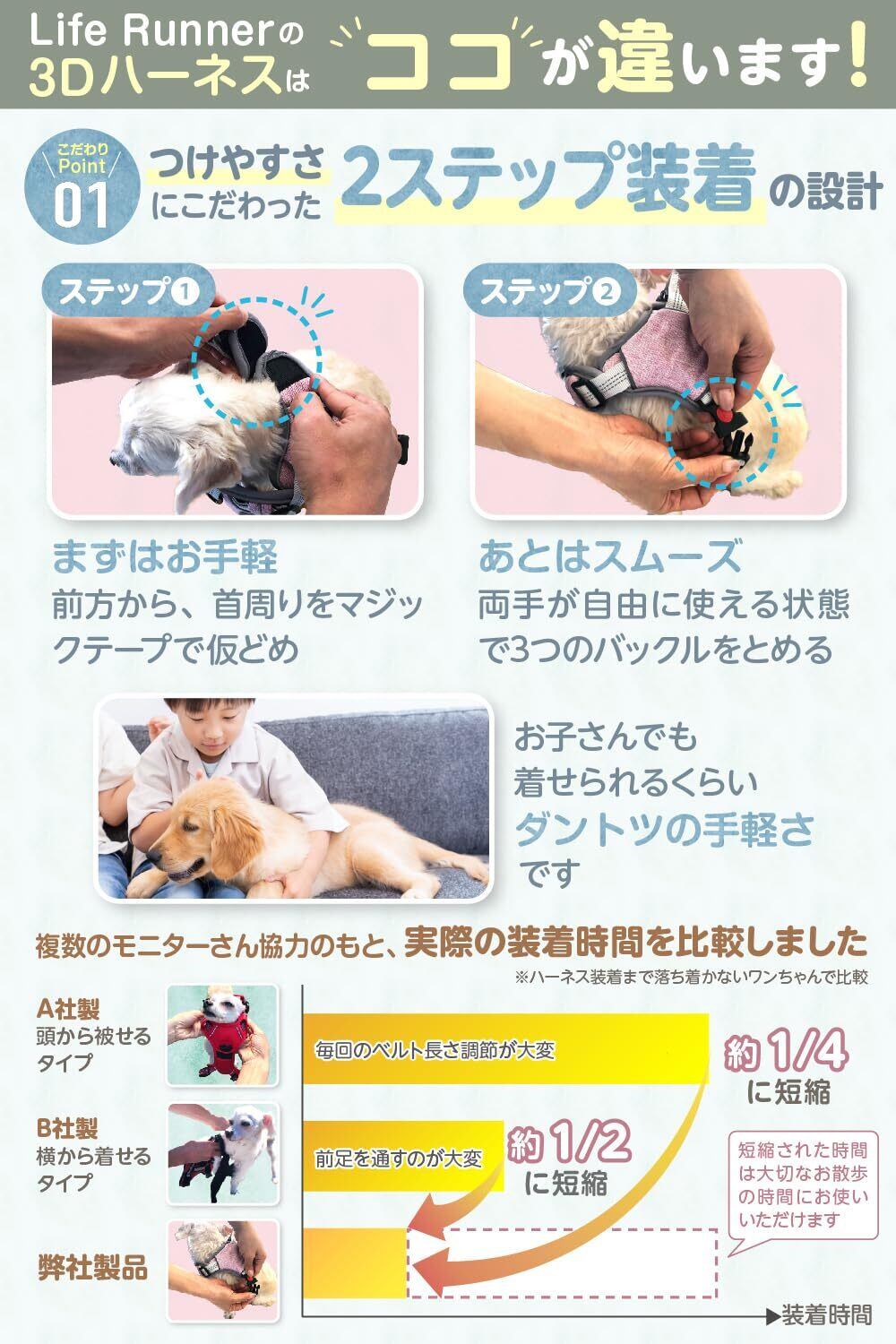 【手軽に装着】落ち着きのないワンちゃんでもハーネスが装着しやすいよう、マジックテープによる仮止め機能を追加しました。お腹を保護する同タイプの犬用ハーネスと比べて、手軽さが大幅に向上しました。