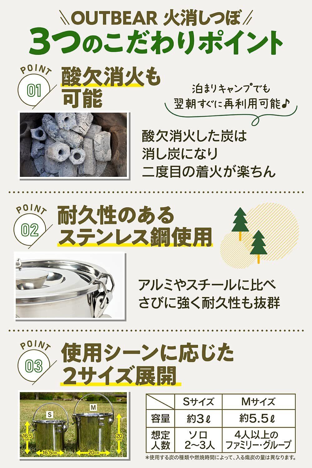 【セット内容】サビに強く、耐熱性・耐久性の高いステンレス製の火消し壺です。サイズはSとMの2種類あります。 オシャレな帆布収納ケース付きだから、灰汚れを気にせず持ち運びができます。