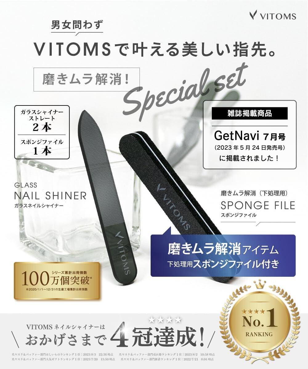 【プロネイリスト推薦】[VITOMS ネイルシャイナー(解説動画付)] こだわり仕様のつめみがき・つめやすり。キメの細かいヤスリ目が、爪の表面にワックスがけしたようなツルツル・ピカピカの輝きを与えます。爪みがきとしてだけでなく、爪の先端を整えるなど爪ヤスリとしてもご利用いただけます。/品質、デザイン、ケースの細部までこだわりました。プレゼントやギフトにもピッタリなパッケージでお届けいたします。※本商品は雑貨です。