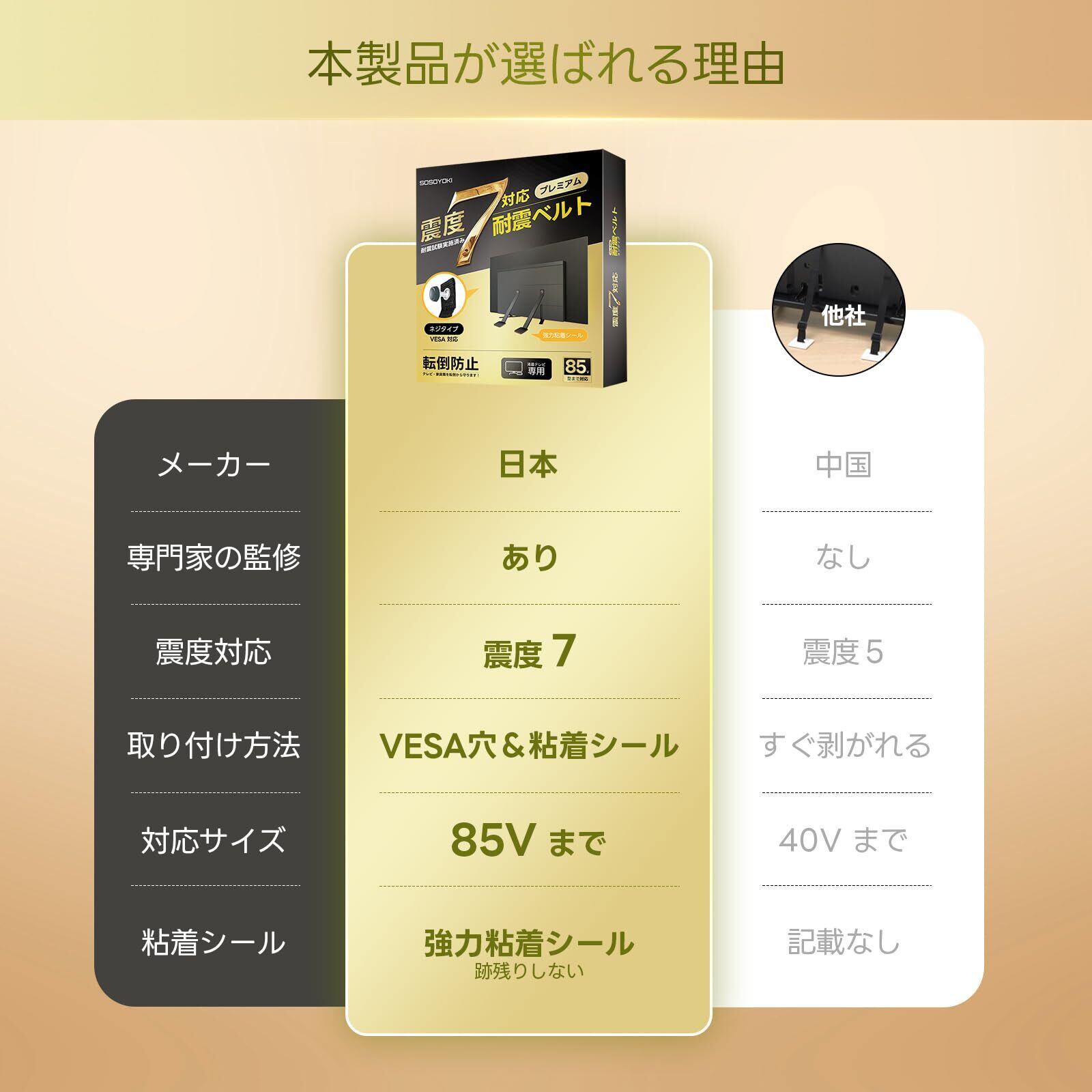 【耐震ベルト・プレミアム】震度7相当の振動試験をクリアし、耐震力はトップクラス。テレビ/液晶モニター裏面のVESA穴を利用して、転倒を防止します。地震などの転倒を防ぎ、ケガを予防する安全対策アイテムです。