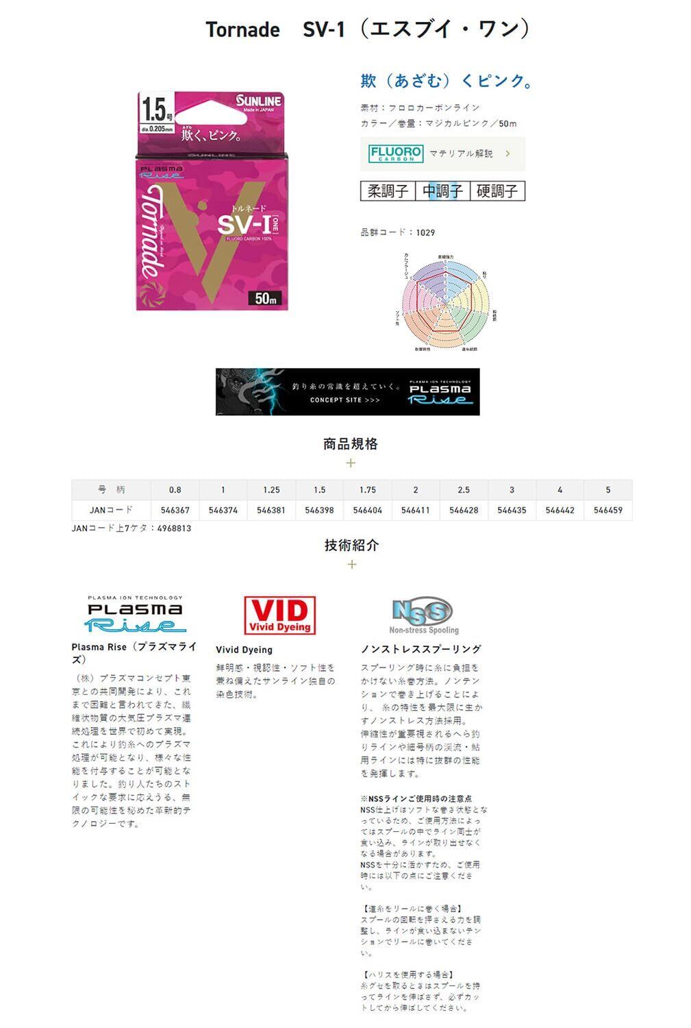 コンセプト:【トルネード SV-1】……魚には見えない実績と信頼のマジカルピンクカラー採用。「プラズマライズ」により表面を改質し「水接触角0°」を実現。溶け込むように仕掛けが落ち水中で魚に違和感を与えにくい糸に仕上がりました