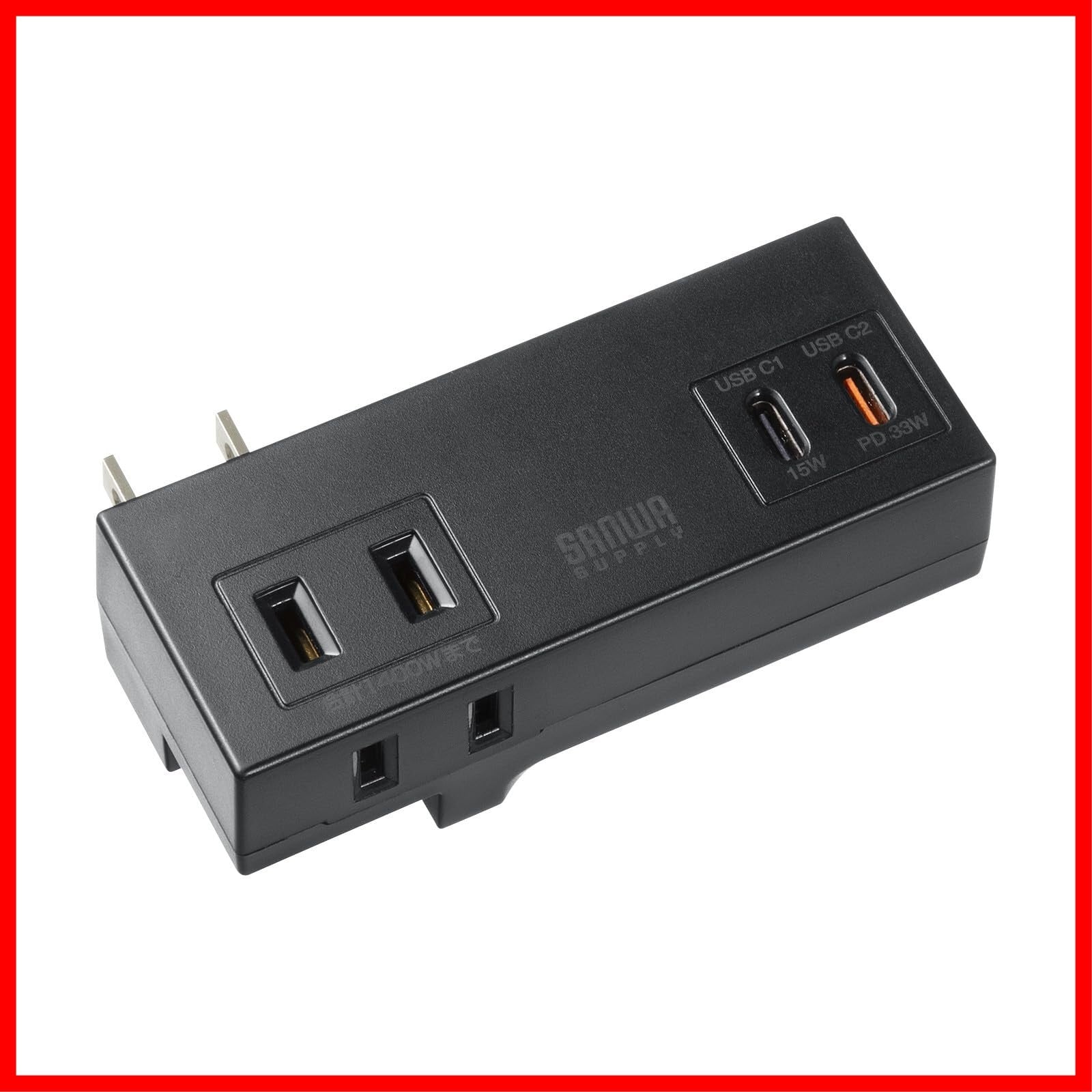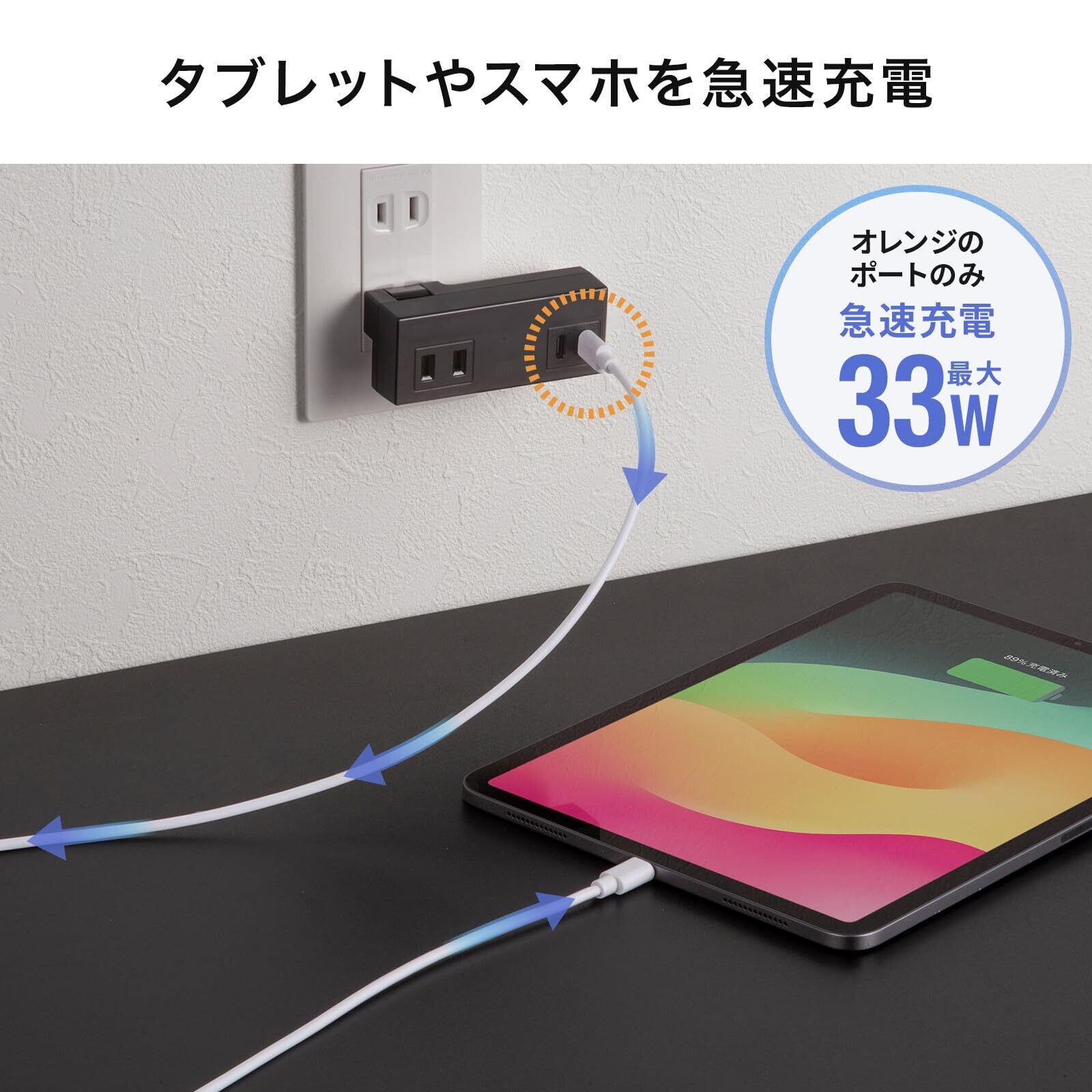 サンワサプライ 電源タップ PD33W (AC×2個口+USB Type-C×2) スイングプラグ 小型 モバイル ブラック TAP-MC2AC2BK