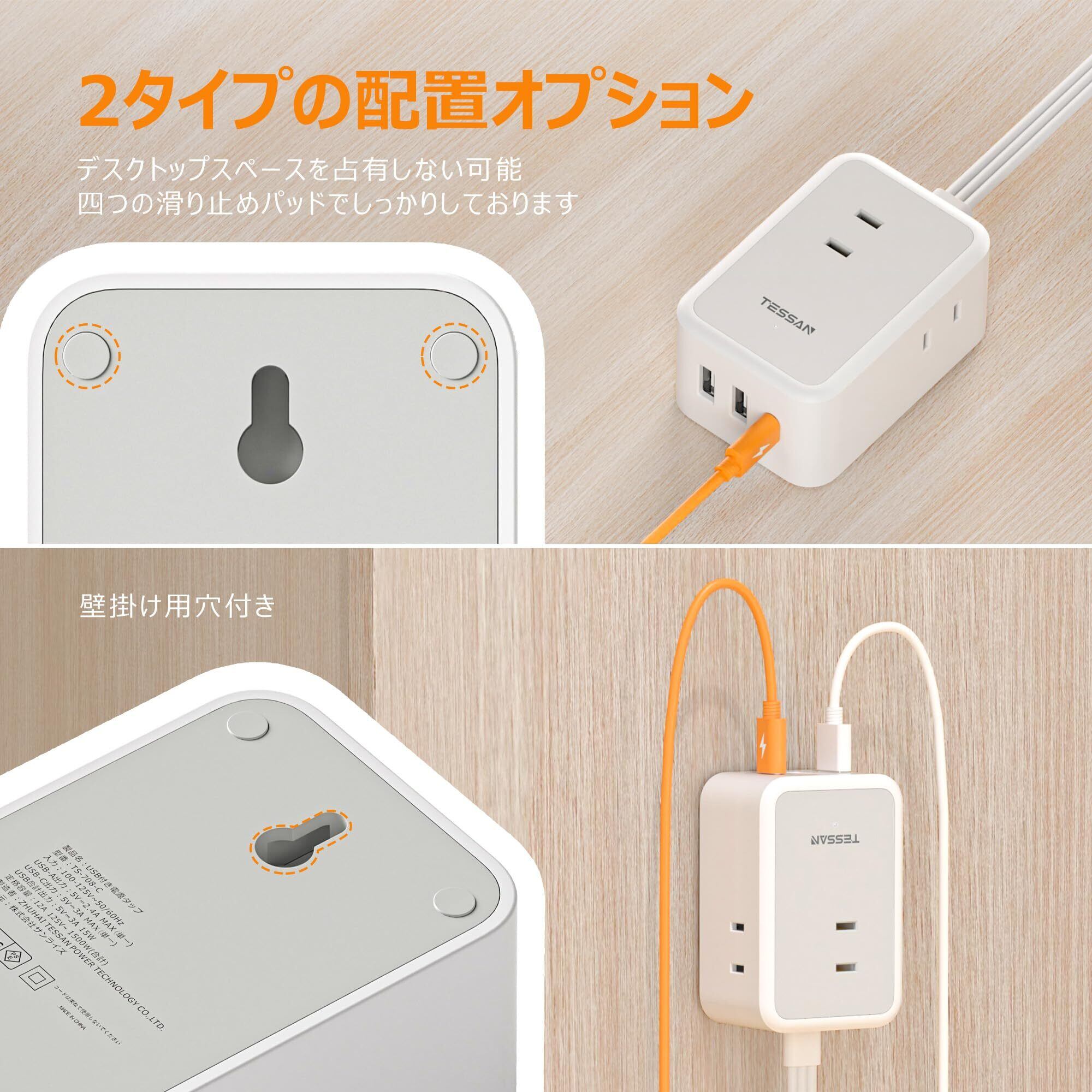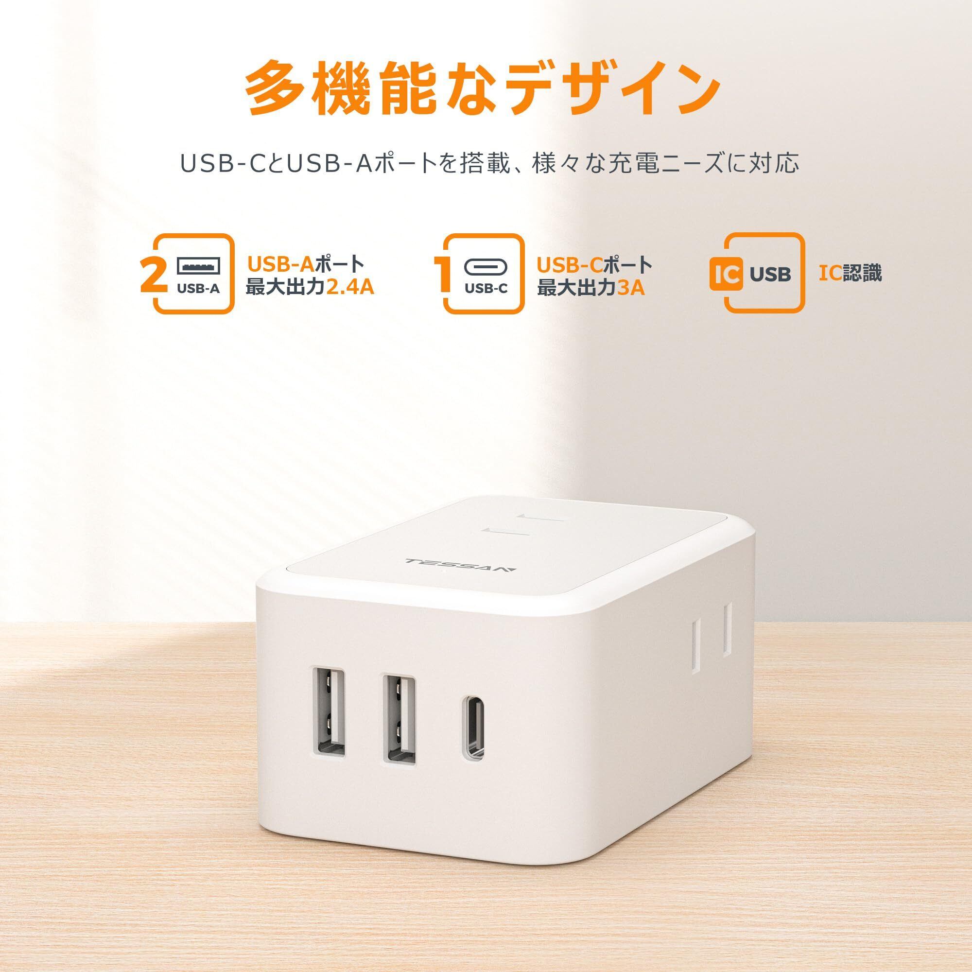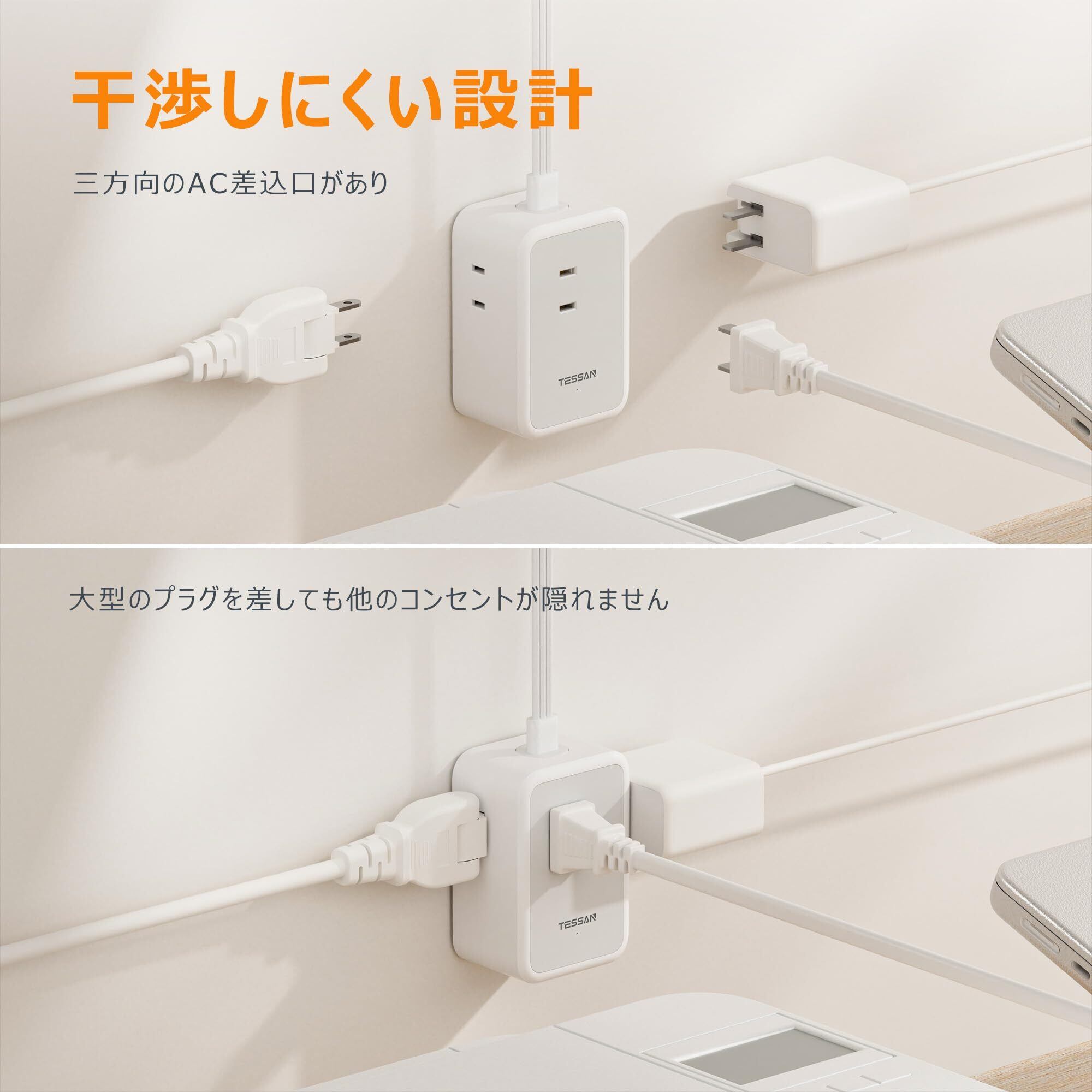 延長コード 2m 薄型 電源タップ usb コンセントタップ たこあしコンセント テーブルタップ TESSAN 3個AC 1個タイプC 2個タイプA 電源コード type-c タコ足配線 隙間