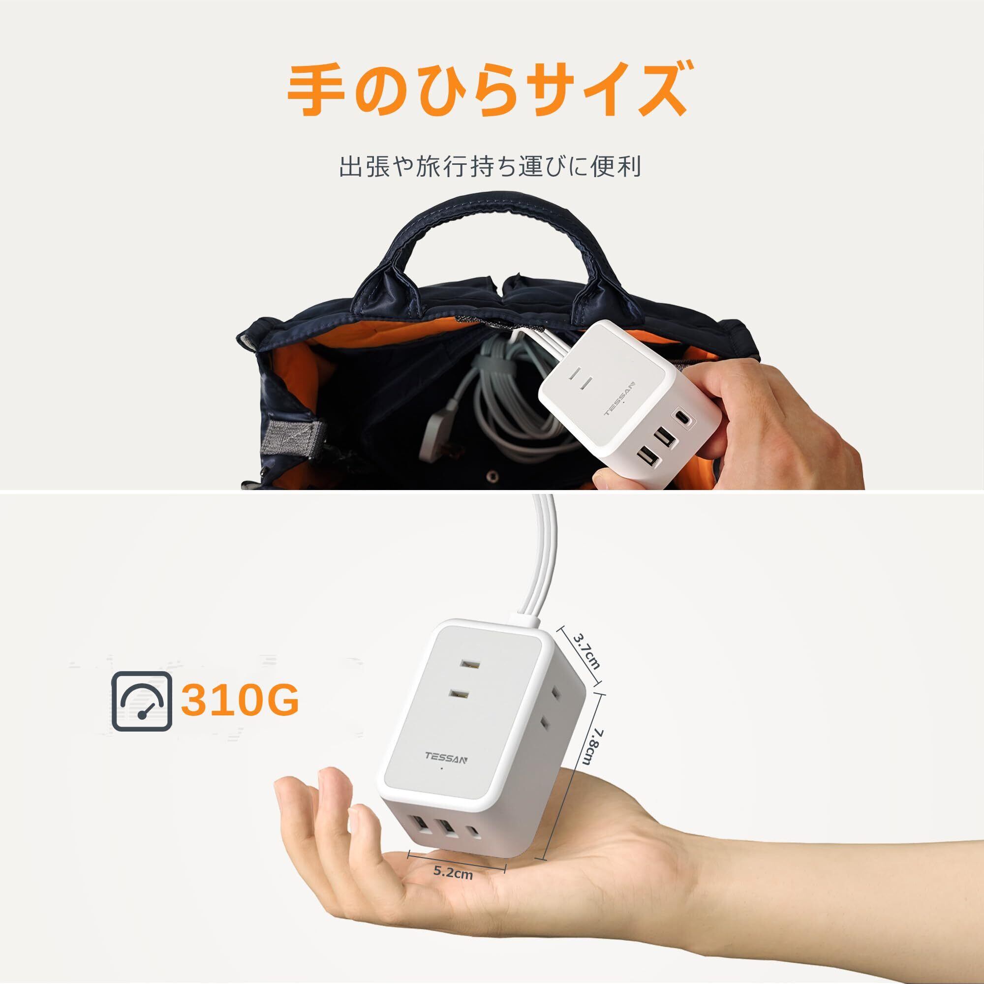 【省スペース設計】サイズはわずか7.8x5.2x3.7cm、310gの小型で軽量なusb付き電源タップです。場所を取らないコンパクトなデザインなので、持ち運びも楽です。旅行や出張に最適です。