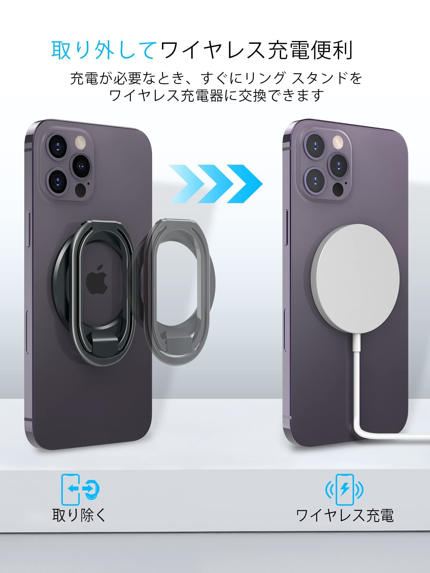 【内蔵マグネット、接着剤に別れを告げる】 enGMOLPHY最新多機能マグネット式スマホリングは、内蔵強力なMag_safe マグネットバックリング、iPhoneとリングバックルマグネットを自動的かつ正確に位置合わせて 1秒で吸着!ワイヤレス充電の前に、いつでも分取り外し。各種MagSafe充電器の邪魔にならない便利なサポートリングスタンドです。 接着剤を免れ、残留なし、こんなに便利さ! iPhone15 / iPhone14/13/12ファンに欠かせないマグセーフ対応アクセサリ。