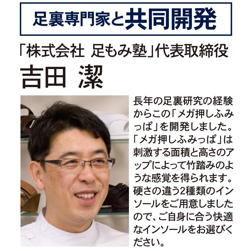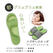 青竹踏みのように大きく隆起したインソールで足裏のコリをほぐし、血行を促進歩くたびにあなたの足をリフレッシュ【ピンク】グイグイ刺激でイタ気持ちいい。 硬めのインソール【グリーン】プニュプニュ刺激で心地いい。 軟らかインソール足裏専門家と共同開発「株式会社足もみ塾」代表取締役 吉田潔氏長年の足裏研究の経緯からこの「メガ押しふみっぱ」を開発しました。「メガ押しふみっぱ」は刺激する面積と高さのアップによって竹踏みのような感覚を得られます。硬さの違う2種類のインソールをご用意しましたので、ご自身に合う快適なインソールをお選び下さい。 [※こちらの商品はピンクです。]