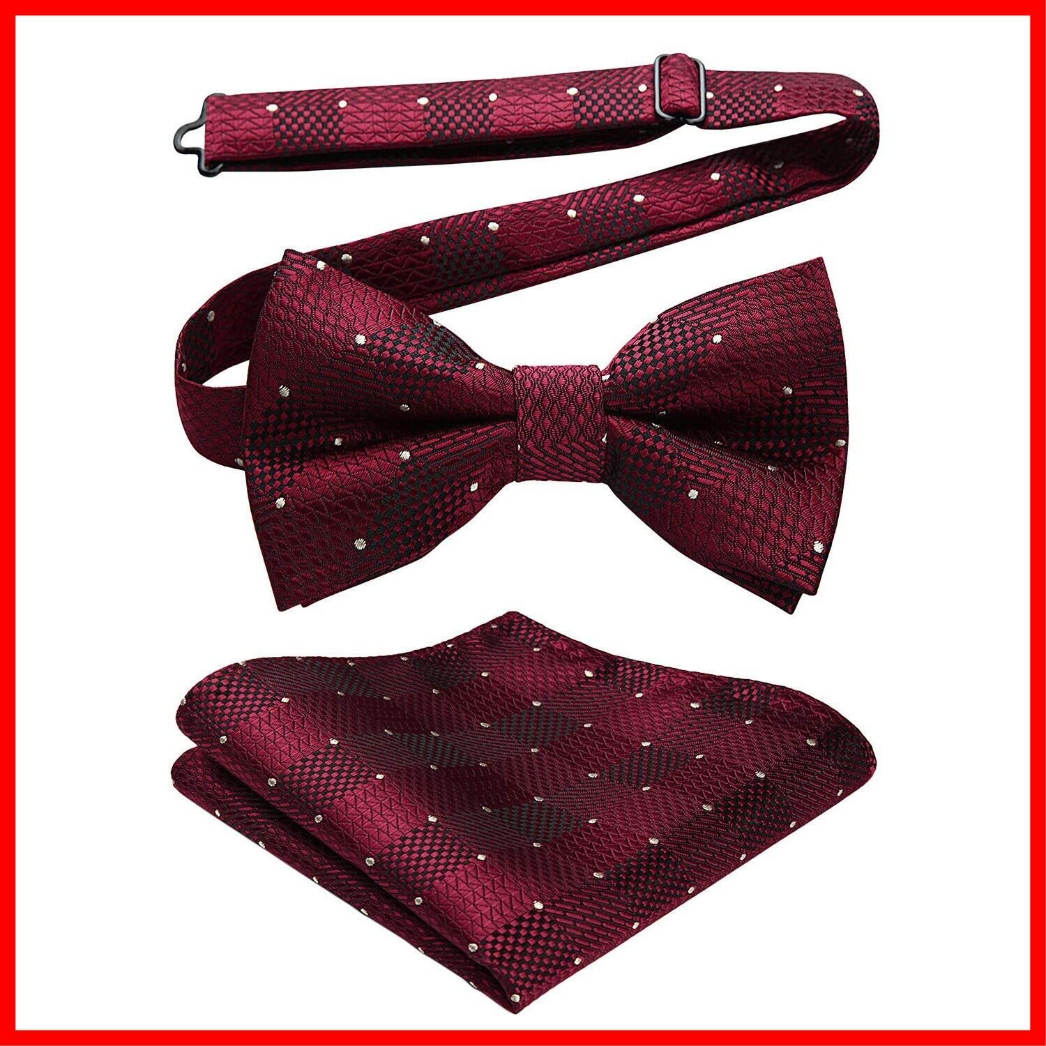 【パッケージ情報】ポリエステルとシルク製蝶ネクタイ:横12cm X 縦 7cm、首回りは32cm~52cm調節可能 ┃ チーフ:31cm X 31cm。