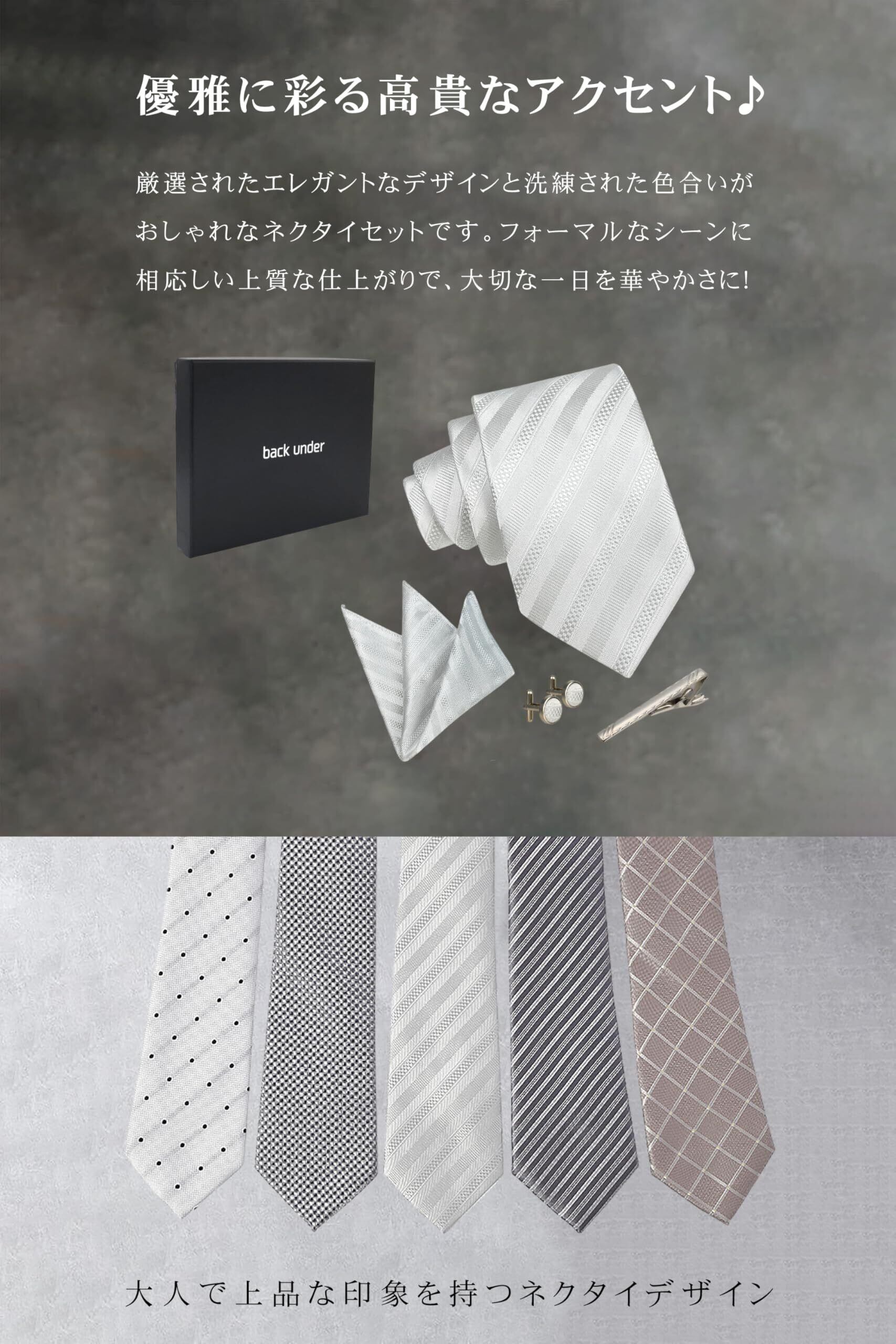 [back under] ネクタイ 4点 チーフ セット 結婚式 シルバー メンズ ネクタイセット グレー ネクタイピン ポケットチーフ カフス ボタン ギフト箱付