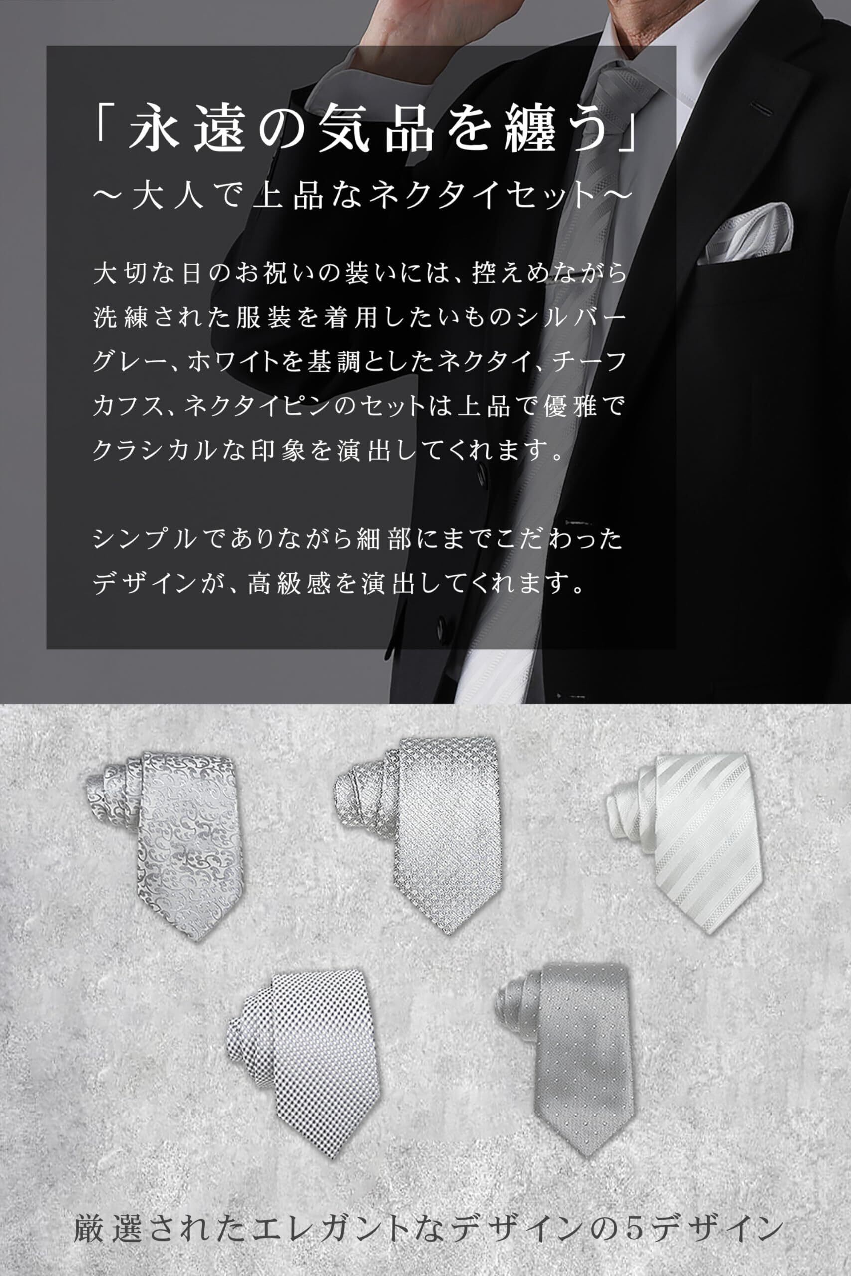 【ポイント3 フォーマルなイベントにおすすめな4点セット】 フォーマルなイベントに便利なネクタイ・ネクタイピン・ポケットチーフ・カフスボタンの4点セットです 父親、親戚、親族、友人での結婚式の出席におしゃれでお得な4点セットで、プレゼントにも最適です
