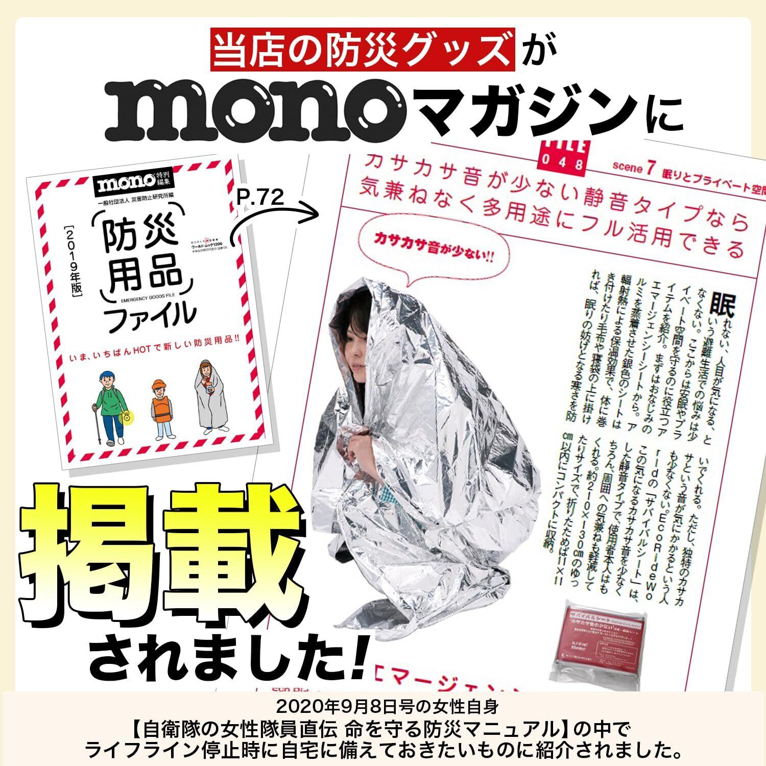 カサカサ音が少なく静かな静音タイプの防寒保温サバイバルシート ( アルミシート エマージェンシーシート EMERGENCY SHEET ) です。 スポーツ観戦や緊急災害時などにブランケットの代用としてご使用いただける、 軽量でコンパクトなアルミブランケットです。 小さな音でも大人数になると、カサカサと音がして落ち着きませんが、 このシートは耳障りな音があまりしません。 コンパクトにたたまれているため、バッグや防災リュック、車の中などに常備でき、 持ち運びやすく場所を取りません。防災ガイドを付属しており、非常持出品チェックリストや緊急ダイヤルなど災害への備えについて 必要な情報が提供されています。またコンパクトに収納できるよう専用のポーチを付属しています。