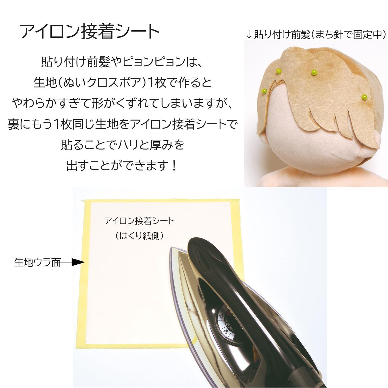 貼り付け前髪等の生地の貼り合わせには「アイロン接着シート」を使用。