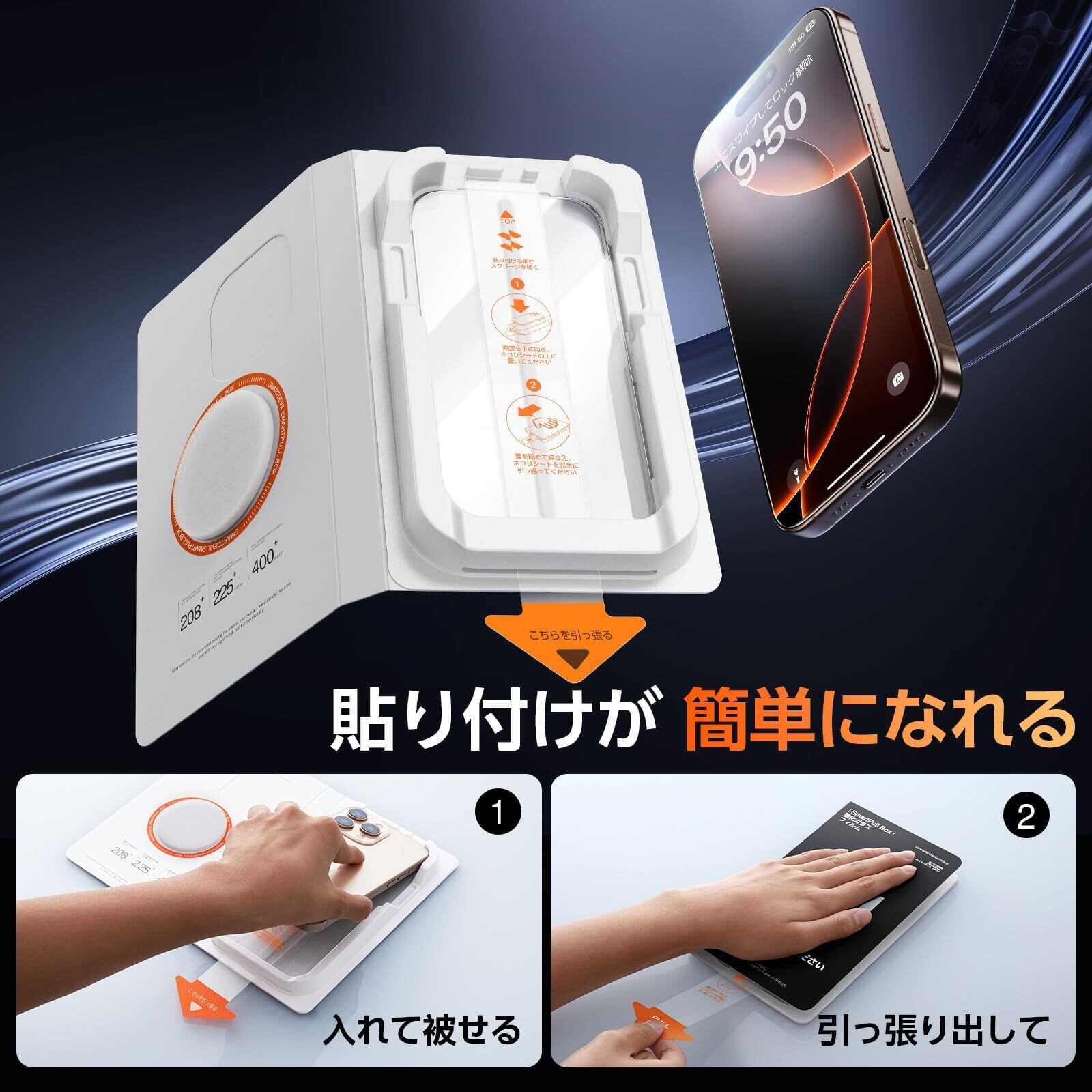 【新しい貼り付け体験】専用ボックスの中にスマホを入れて、シートを引くだけで簡単に貼り付け可能です。