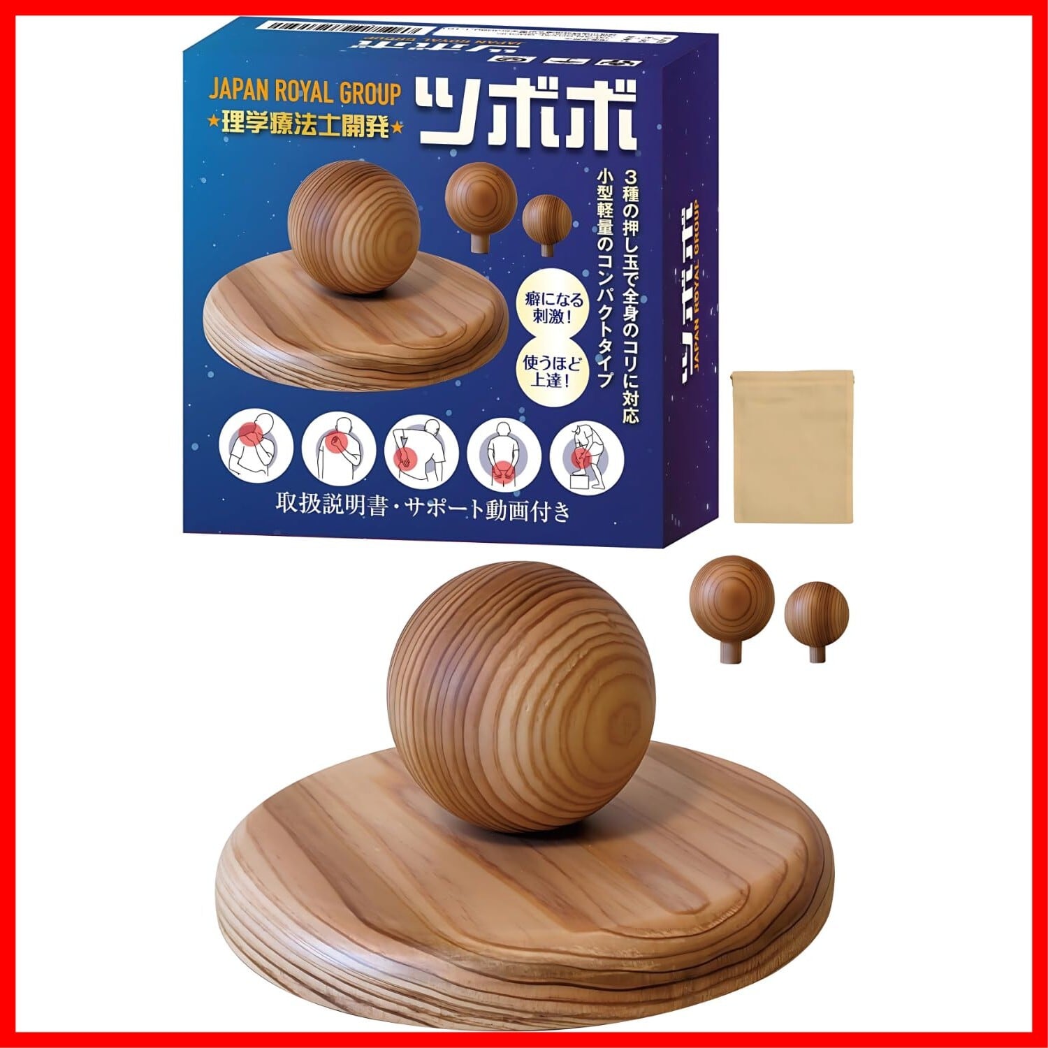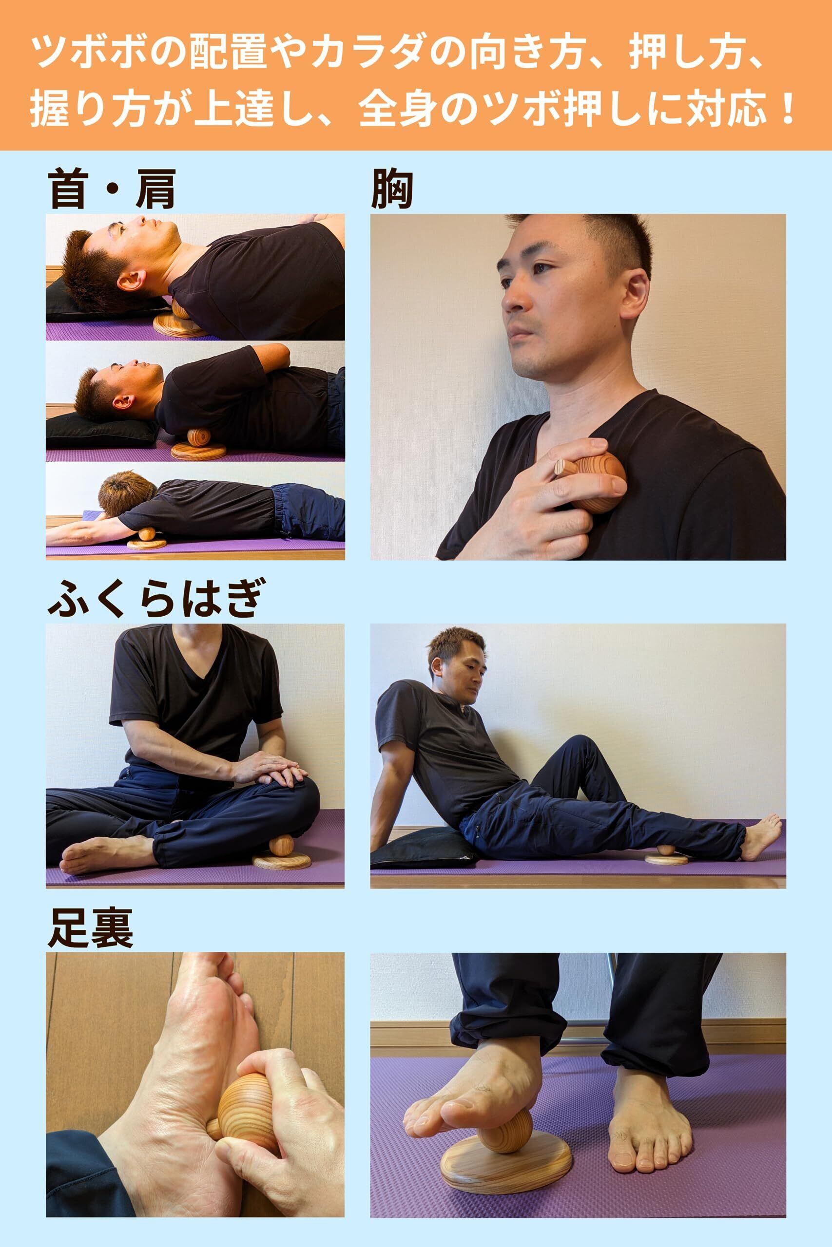 【理学療法士開発】ツボボ 木製ツボ押し器 腰・背中・お尻・太もも・足裏のコリを解消 全身のコリ対応 ピンポイント加圧 安定した土台 按摩・指圧の代用 血行改善 小型軽量 押し玉3種 男女兼用 取扱説明書とサポート動画付き