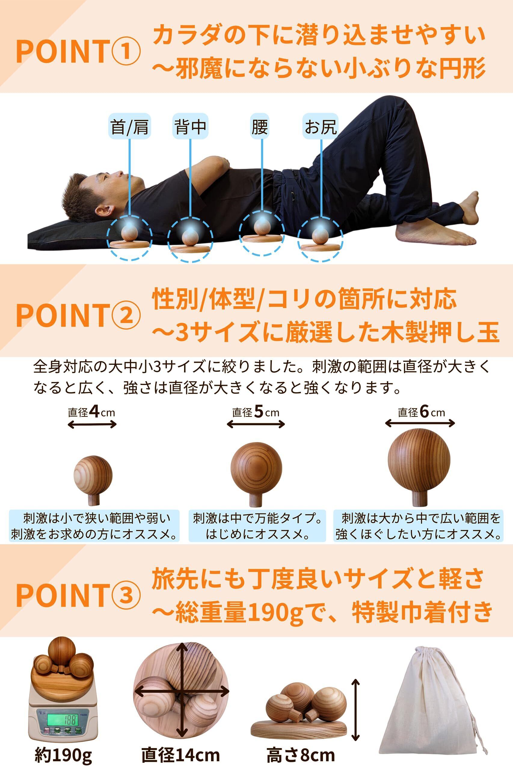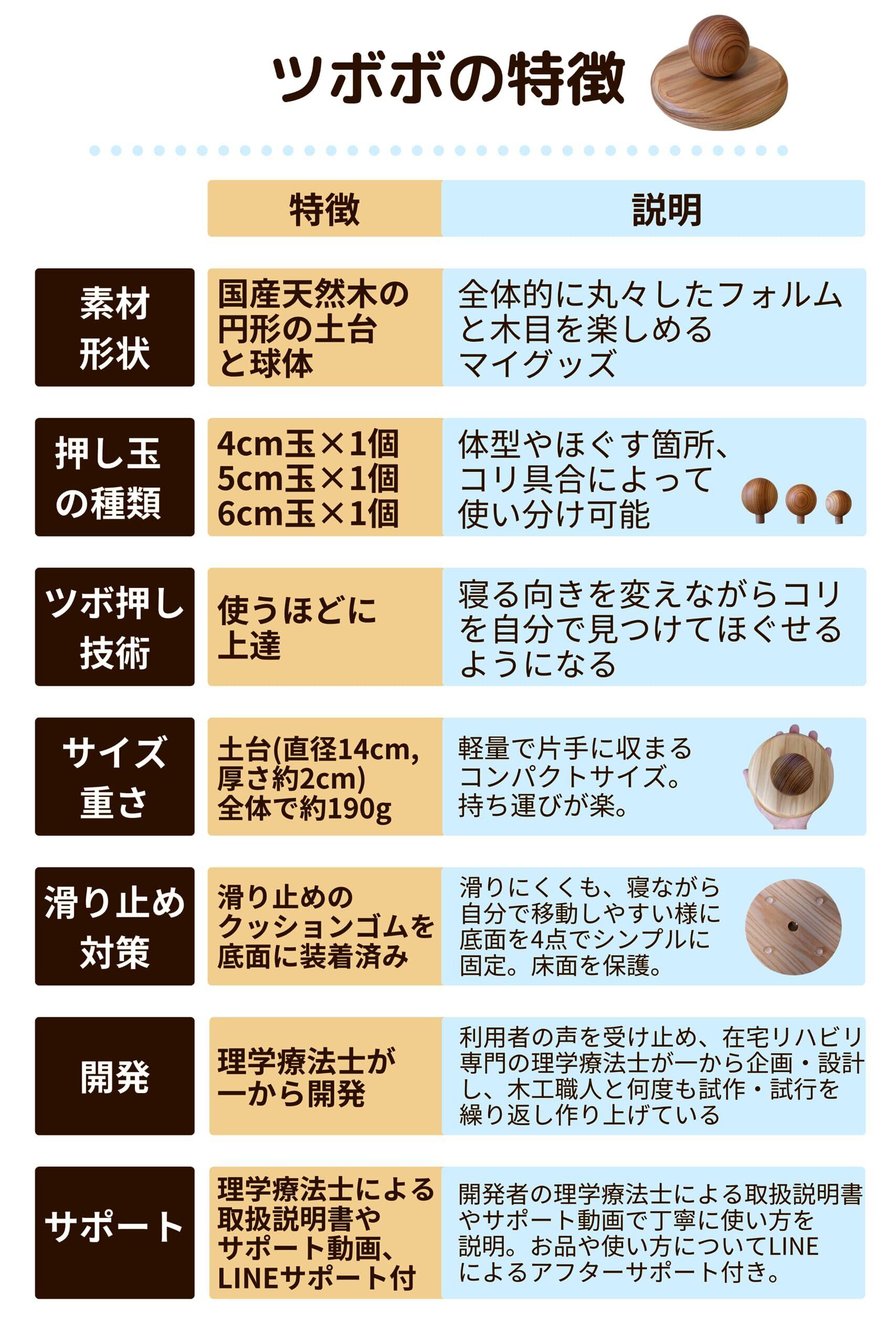 愛着が持てる:横になったままカラダの向きを変えることで、全身のコリを選択的にほぐすことができ、3つのサイズの押し玉を使うことで、使うほどに上達しツボボへの愛着も湧いてきます。押し玉単体でもツボ押しに使用できます。木の温かみが感じられ、小ぶりでシンプルなデザインのため、お部屋においても違和感が少ないです。