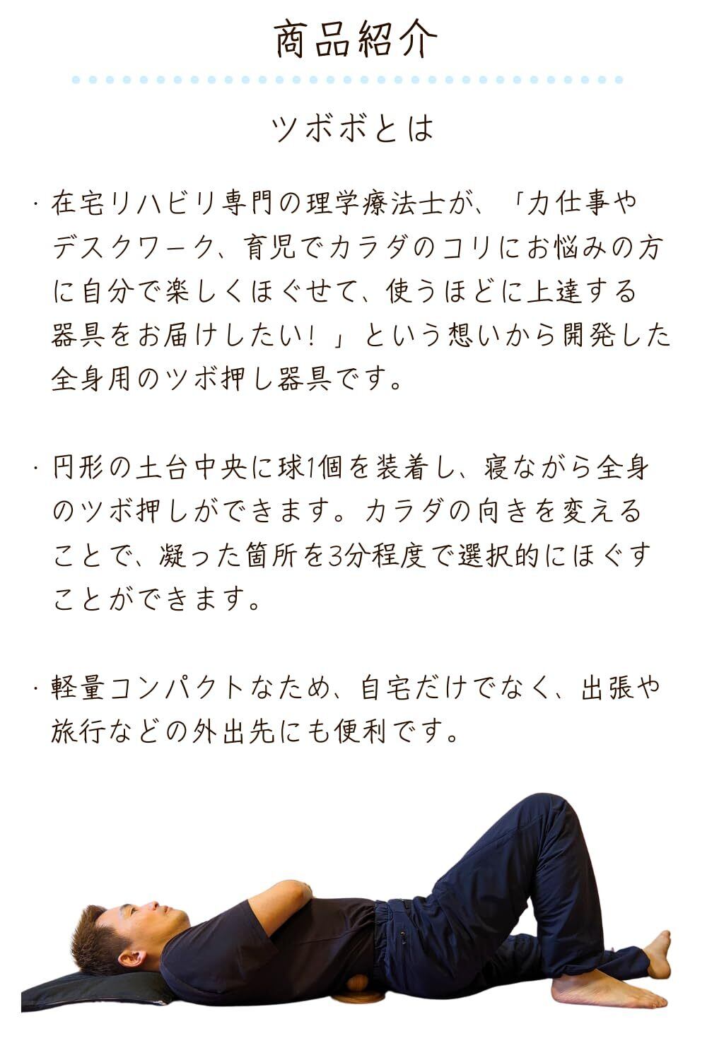 男女兼用で簡単に使える:円形の土台中央に球1個を装着し、寝ながら全身のツボ押しができます。カラダの向きを変えるだけで、凝った箇所を3分程度で選択的にほぐすことができます。土台をシンプルな円形に設計することで、使用中に押し玉が当たっている箇所以外にはなるべく器具がカラダの他の箇所に当たって邪魔にならないようにしました。軽量のため、使用中に手や足でツボボの位置を簡単に変えることができます。土台底面の滑り止めにより、使用時に土台が滑って押すポイントがズレたり、床面が傷つかないように配慮しています。