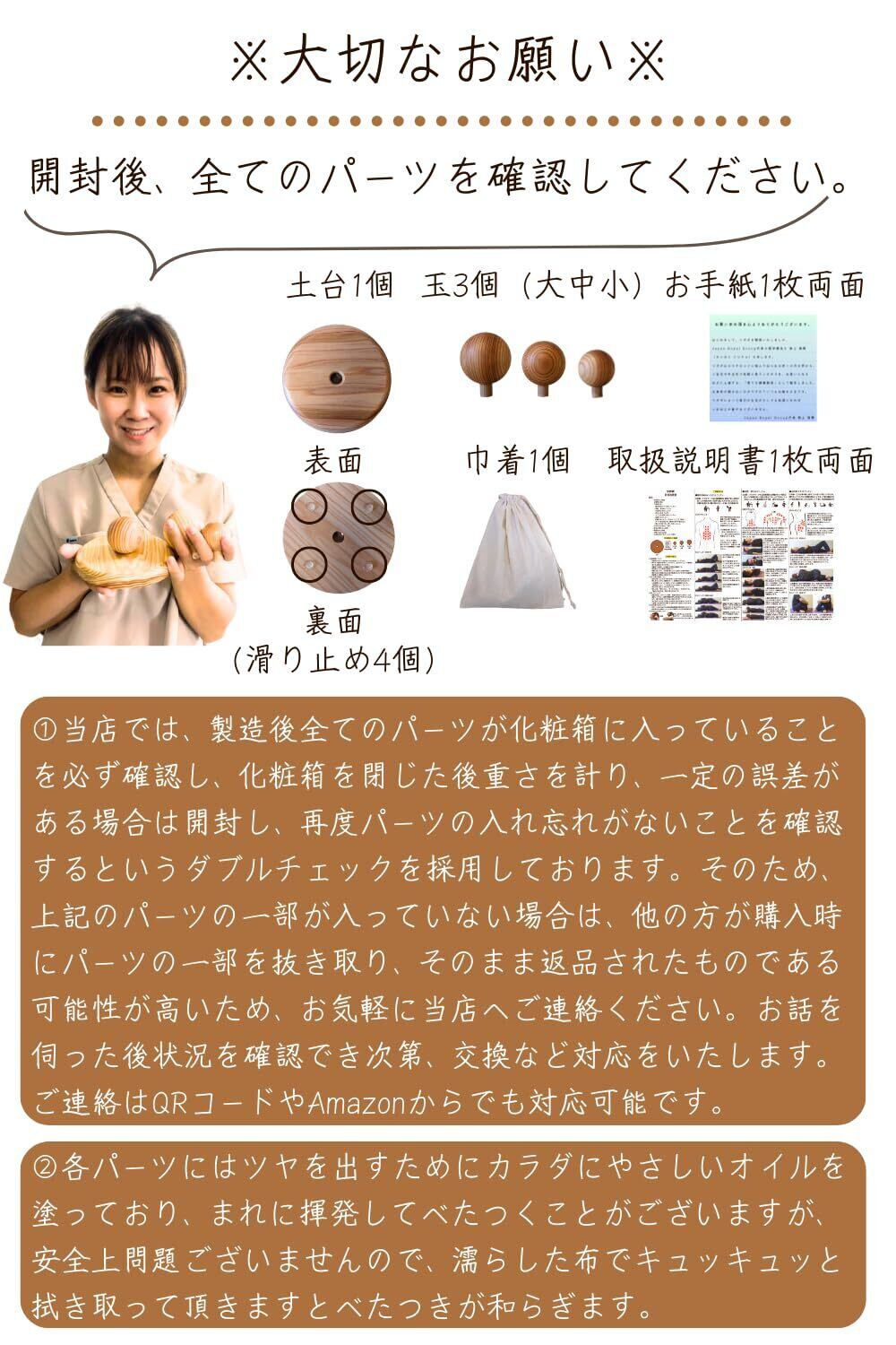 ※重要※①当店では製造後、化粧箱に入れる際に全てのパーツが入っていることを必ずチェックし、化粧箱を閉じた後は重さを計り、一定の誤差がある場合は開封し、再度パーツの入れ忘れがないことを確認するというダブルチェックを採用しております。そのため、ツボ押しのパーツだけでなく巾着袋や取扱説明書等が入っていない場合は、他の方が購入時にパーツの一部を抜き取り、そのまま返品されたものである可能性が高いため、お気軽に当店へご連絡ください。お話を伺った後に状況を確認でき次第、交換などの対応をさせて頂きます。ご連絡はQRコードやからでも対応可能です。②ツボ押しのパーツにはツヤを出すためにカラダにやさしいオイルを塗っており、まれにべたつくことがございますが、特に問題ございませんので、濡らした布でキュッキュッと拭き取って頂けますとべたつきが和らぎます。