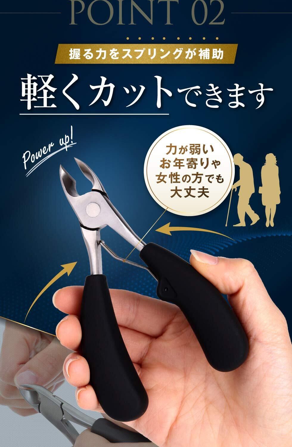 刃先が鋭利でカーブした形状なので、巻き爪用として最適です。硬い足の爪や変形爪などの切りにくい爪でも、切りたい部分を狙って切る事が出来ます。