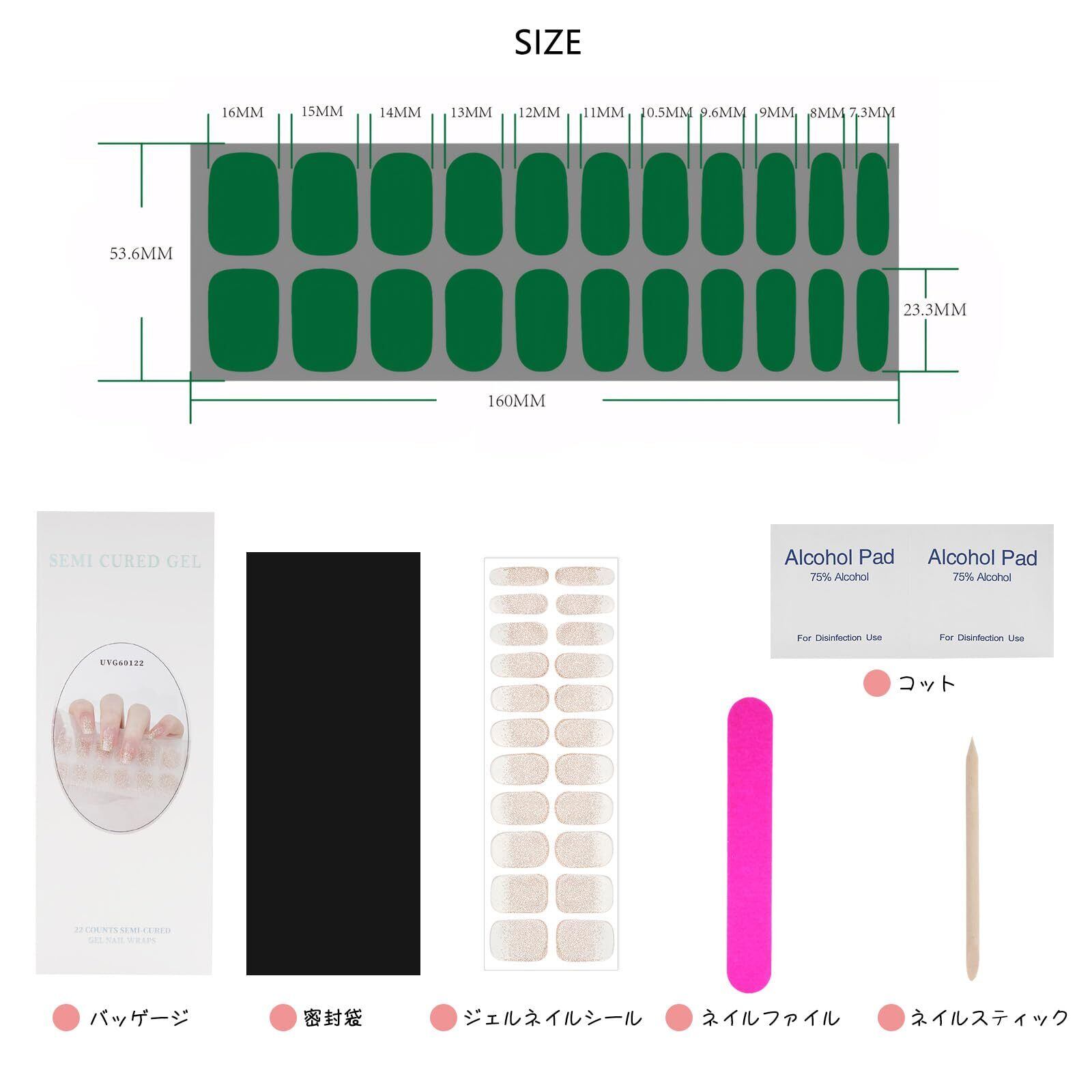 【セット内容】ジェルネイルストリップセットには、密封のネイルジェルステッカー1シート22枚、ネイルファイル1枚、ネイルスティック1本、コットン2枚が入っており、ご自宅でのネイルアートをより便利になります