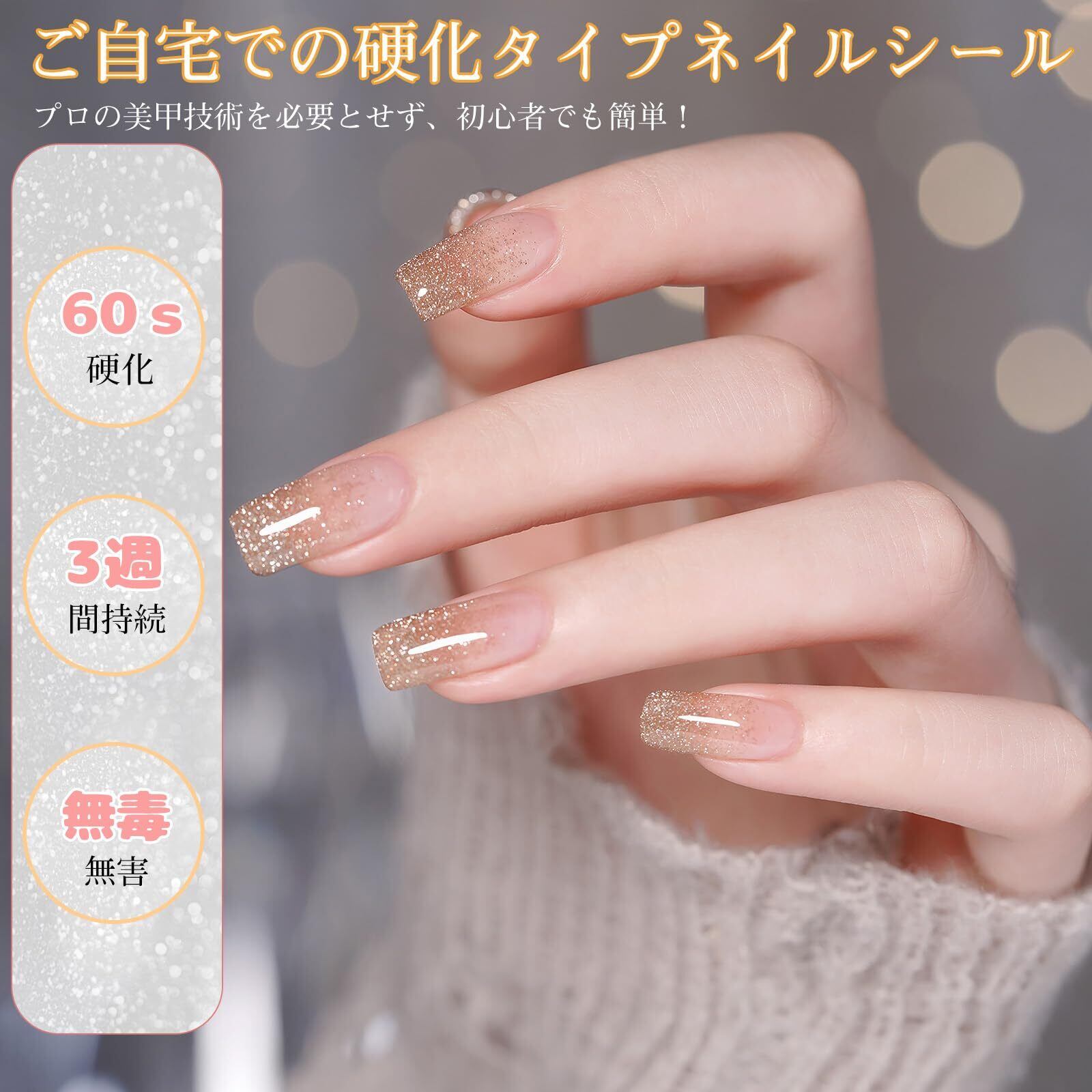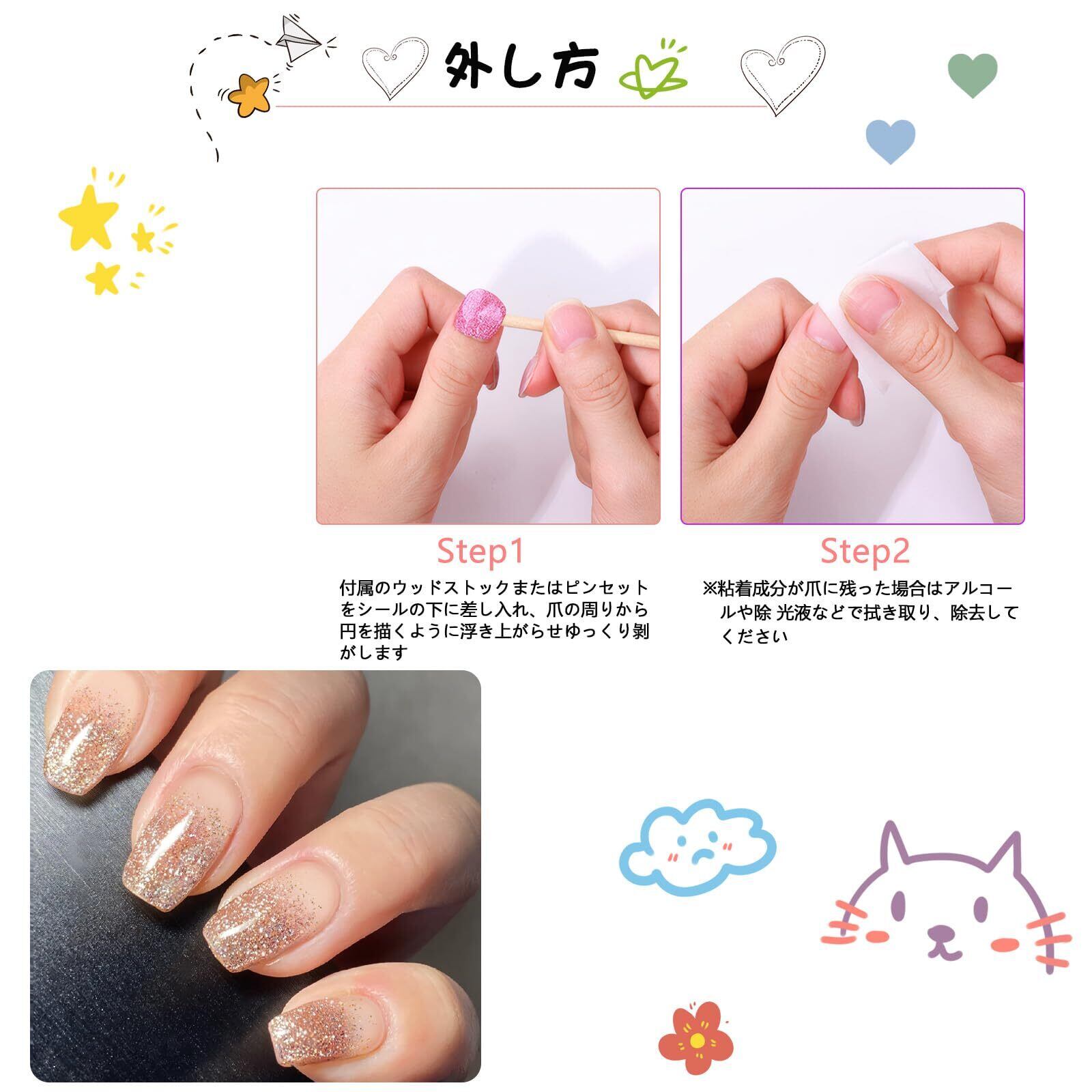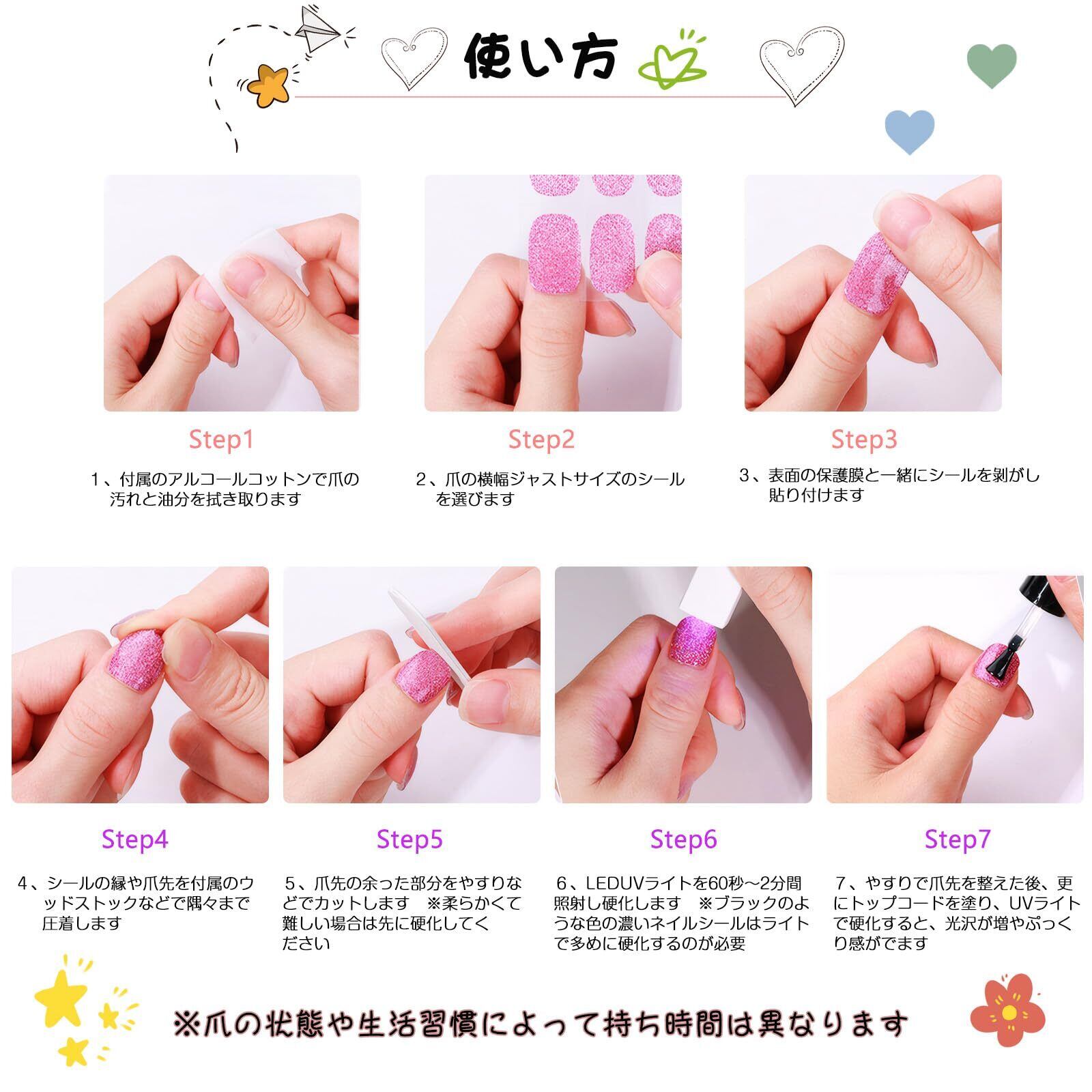 【使いやすい】プロの美甲技術を必要とせず、初心者でもお使いいただけます。自分のサイズに合ったシールを選び、ネイルにつけてからUVライト(別売り)で60s硬化するだけで完成します