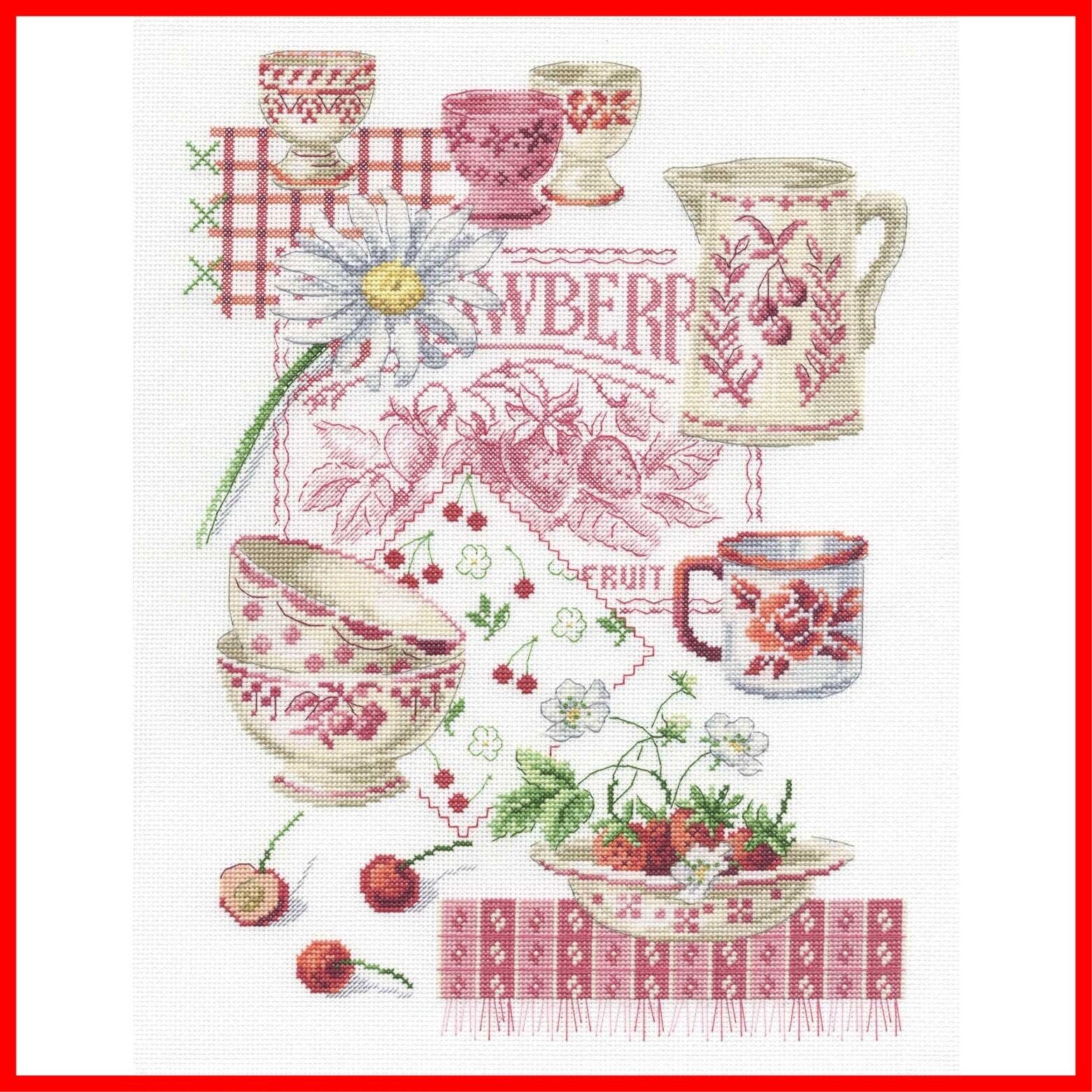 長年愛されている ベストセラー キット 。 夏 の 果物 や 花 、 食器 を 繊細 な 色彩 で表現。 ピンク や 赤 といった可愛らしい カラー イメージ の クロスステッチ の キット です。