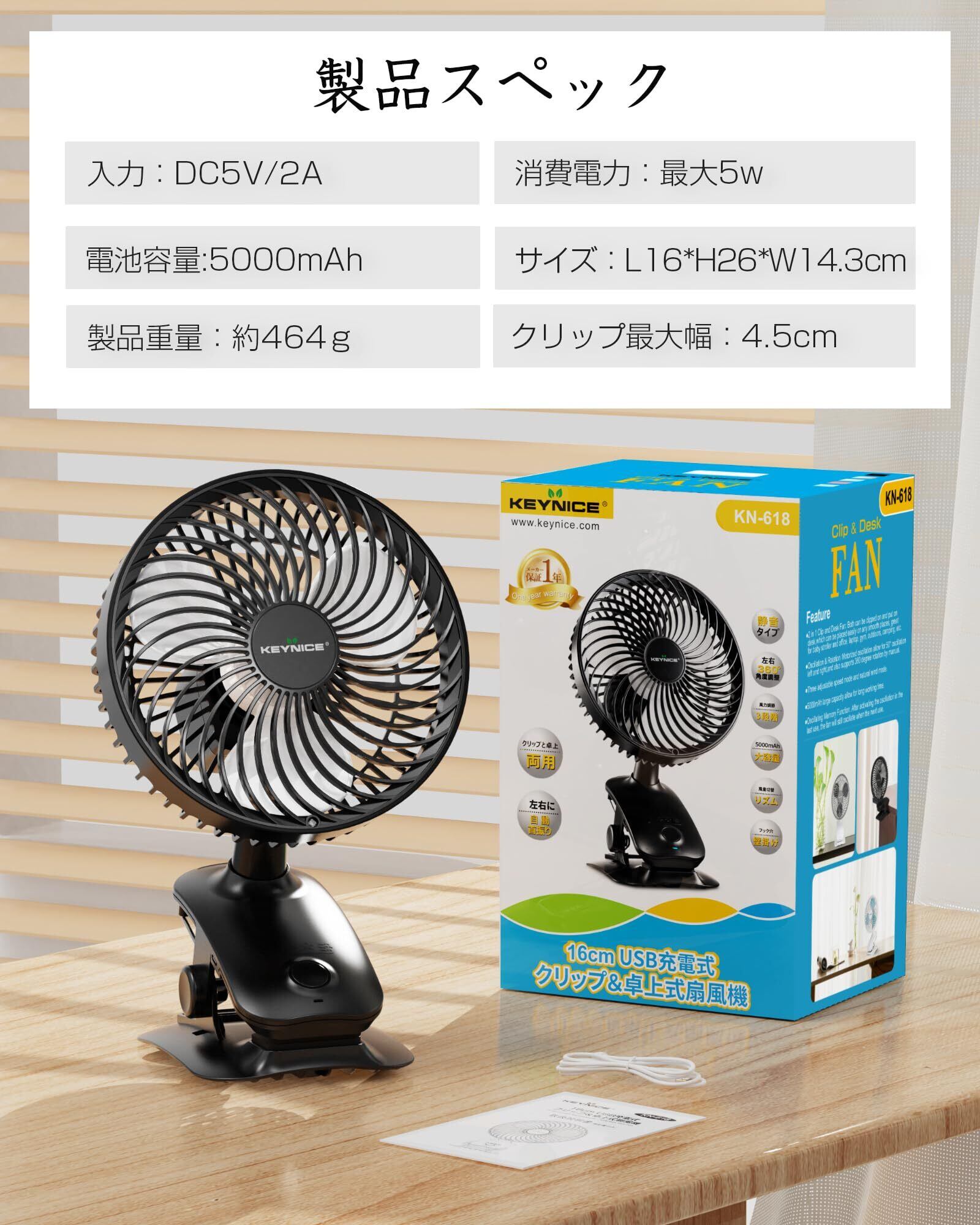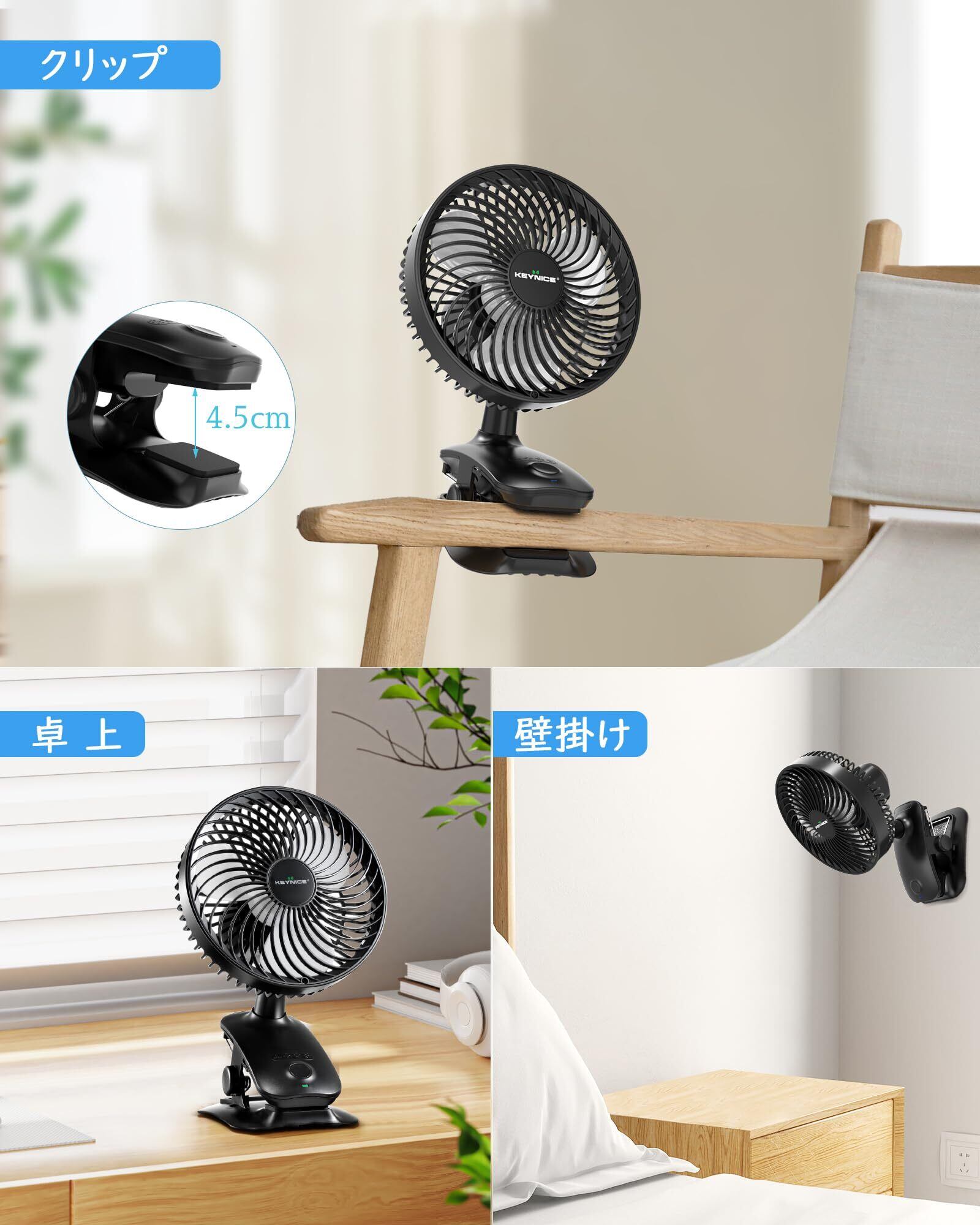 Keynice USB扇風機 自動首振り 卓上 小型 静音 クリップ リズム 充電式 節電 壁掛け USBファン 風量4段階調節 長時間連続使用 日本語取扱説明書付 KN-618 (ブラック)