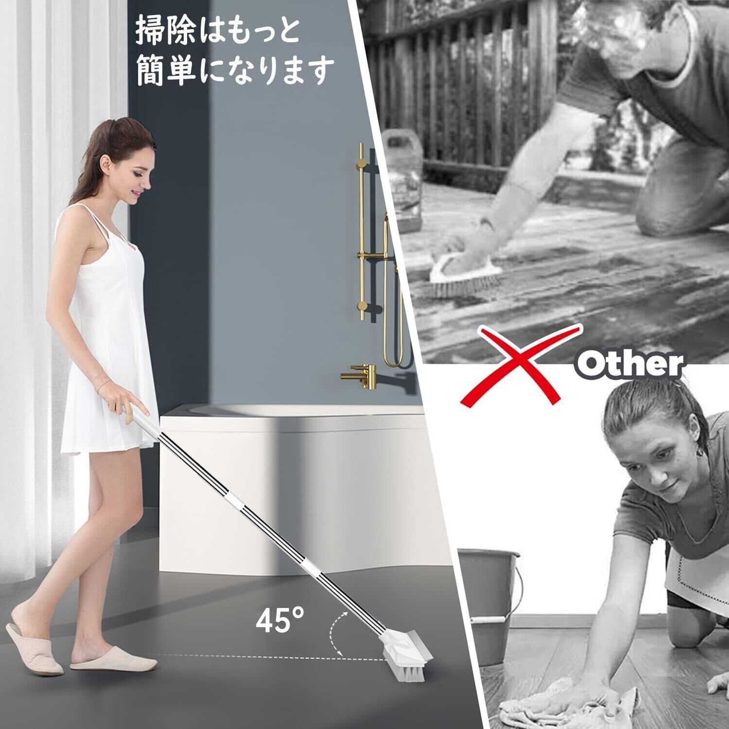 【清掃能力は強い】45度の傾きで、腰に負担が掛からず、掃除しながら膝と背中の痛みを軽減します。ブラシは乾いても濡れても使用できます。壁、キッチン、バスルームに使用されるだけでなく、ガレージ、歩道、スタジアムなどにも最適です。