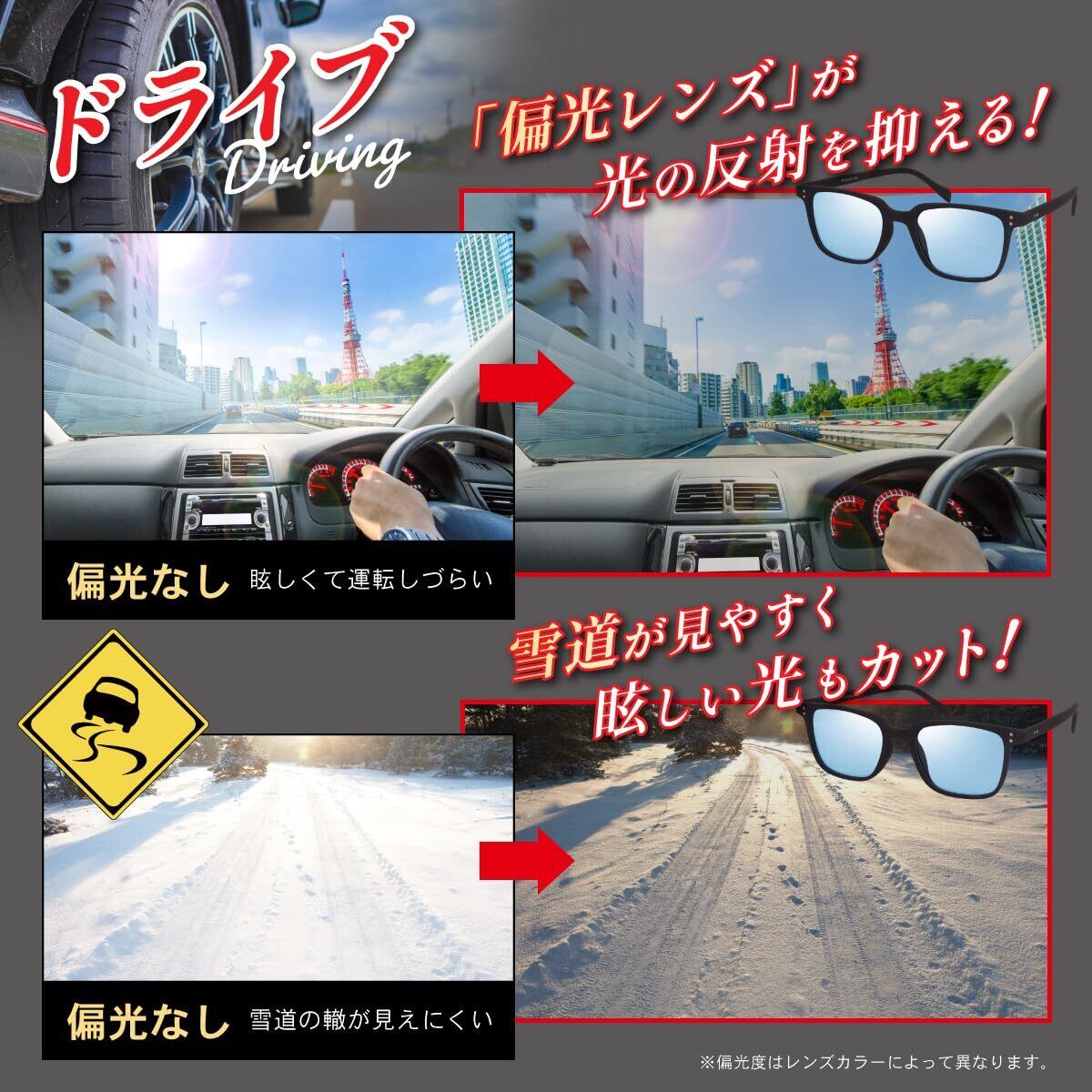 【偏光レンズとは】一般的なサングラスとの大きな違いは、特定の反射光(ギラつき)だけをカットする点です。これにより、単なる眩しさだけでなく、路面や水面からの不快な照り返しを効果的に抑制。クリアで見やすい、爽快な視界を保ちます。さらに、視界を白っぽくさせていた反射光が消えることで、景色が持つ本来の色彩を、よりハッキリと鮮やかに捉えることが可能です。