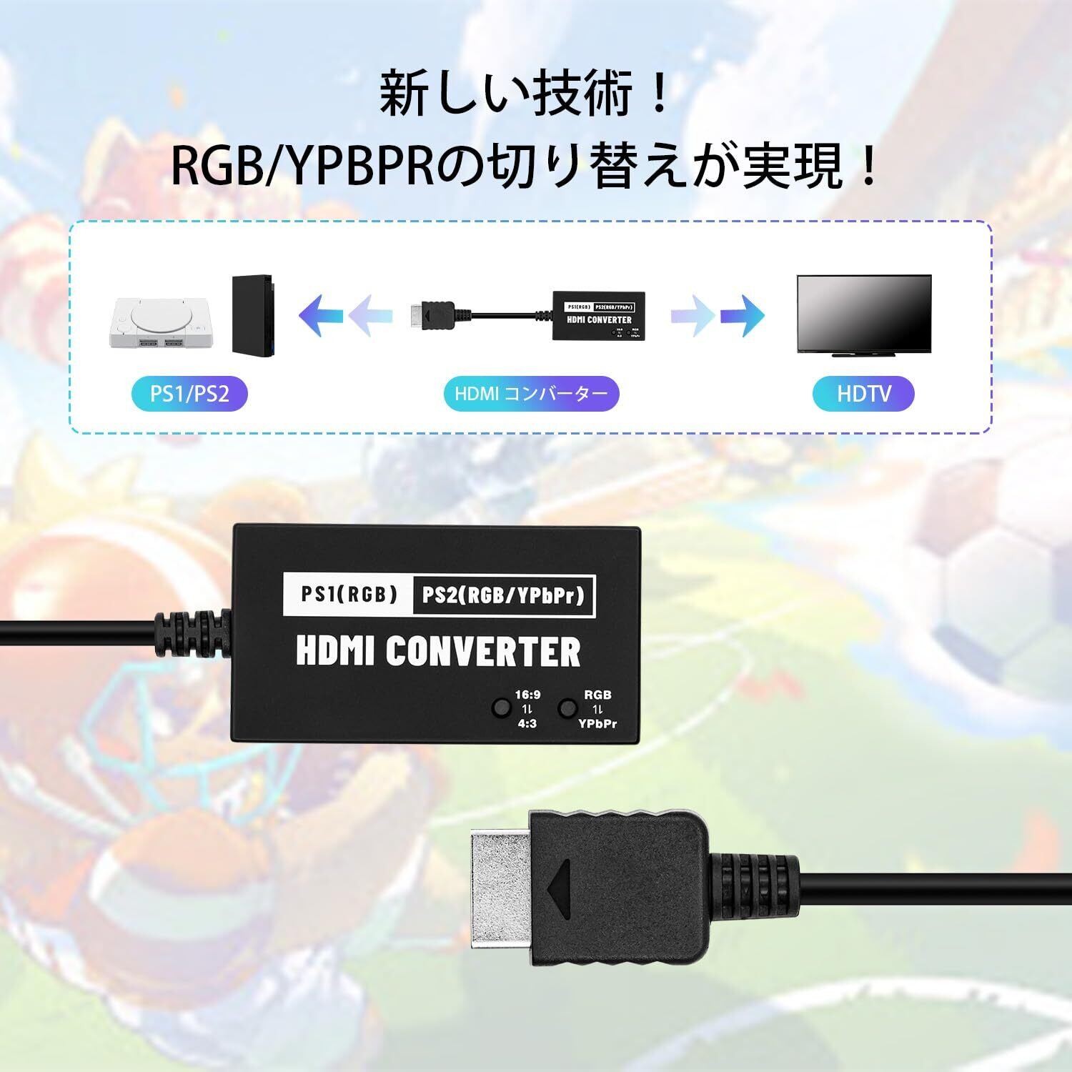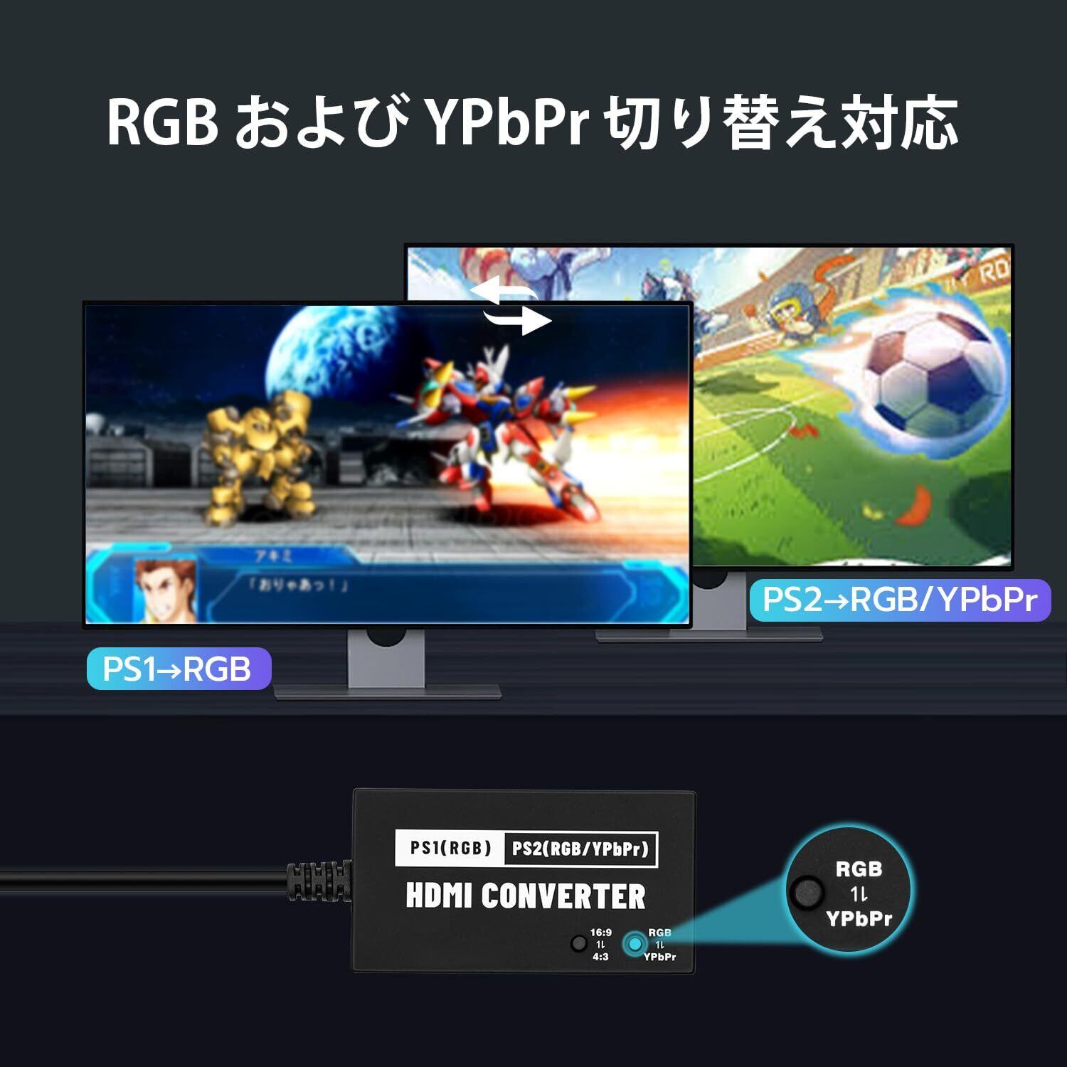 新型 PS1/PS2専用 RGB/YPbPr to HDMI 変換コンバーター 720p 4:3から16:9変換可能 HDMI変換 PS2コンバーター-PS1/PS2対応-ブラック
