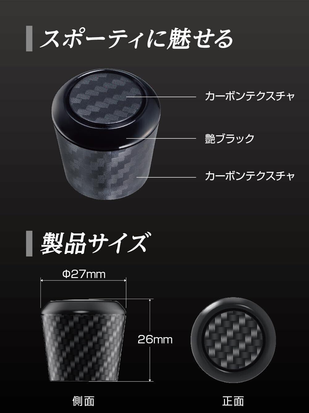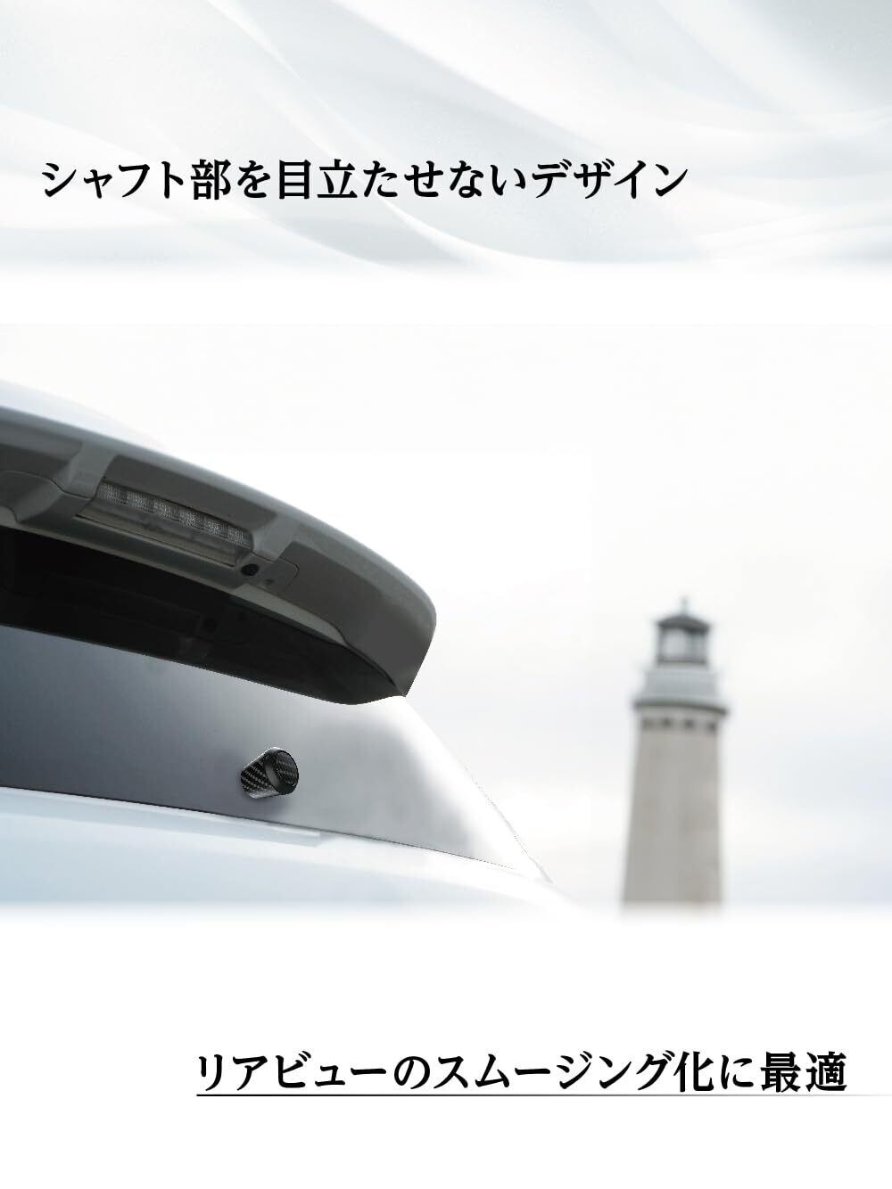 リアワイパーボルトに取付けて、リアビューをドレスアップ。スポーティに飾るカーボンテクスチャデザイン。シャフト部を目立たせず、リアビューのスムージング化に最適。
