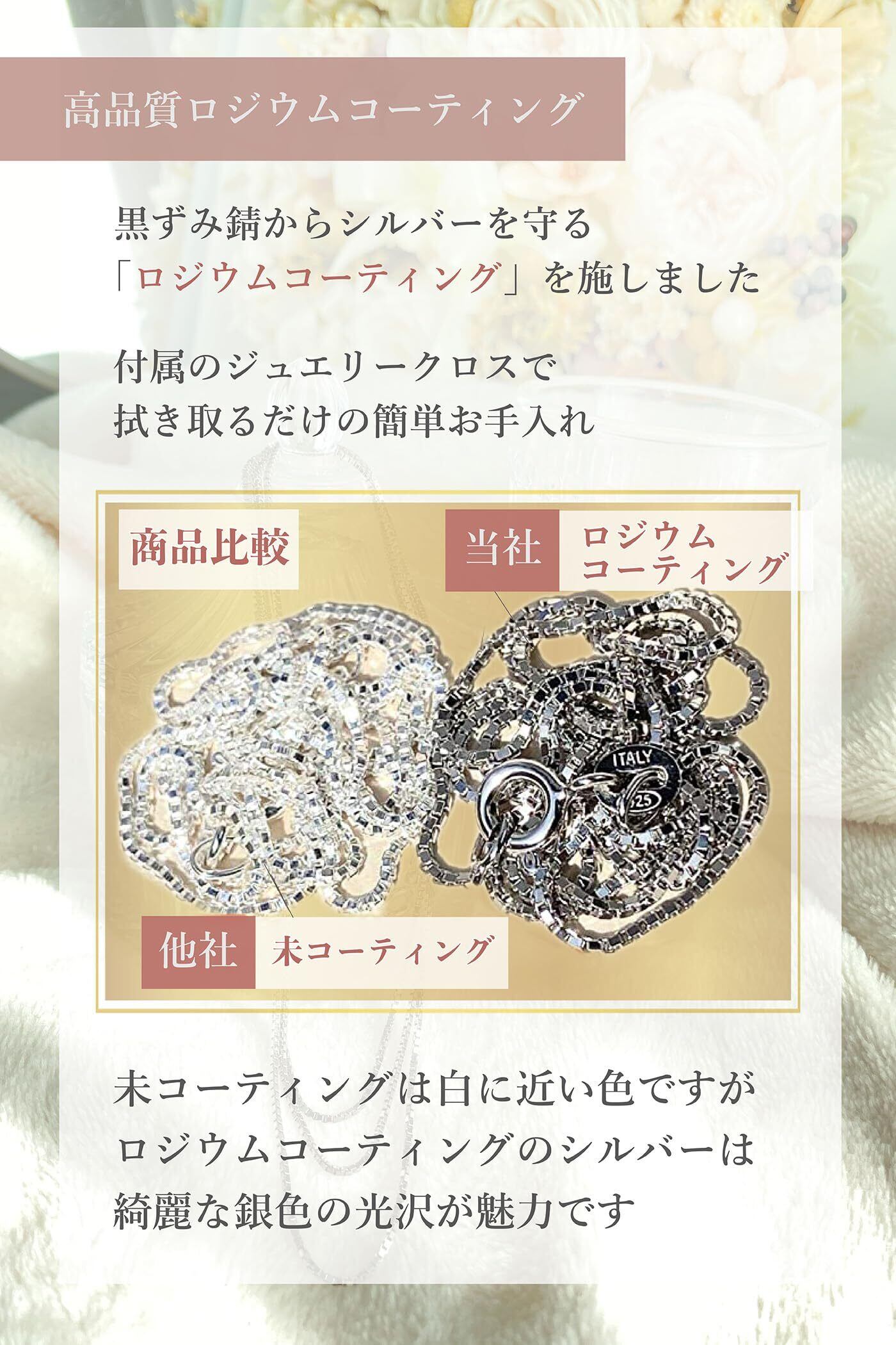 【高品質ロジウムコーティング】シルバー925素材のチェーンを、強度が高いロジウムコーティングで保護。シルバーアクセの弱点である「水・キズ・黒ずみ」から守り、毎日の使用にも耐えられる耐久性を実現しました。シルバーの変色もありませんのでお手入れ不要。いつでもプラチナのような美しく輝くチェーンをご着用いただけます。又、ロジウムはアレルギー性の極めて低い素材です。コーティングなしのシルバーチェンは白に近い色ですが、ロジウムコーティングのチェーンは銀色に近いプラチナのような光沢が楽しめます。あまりにも白すぎるチェーンを敬遠される大人の女性に支持されています。