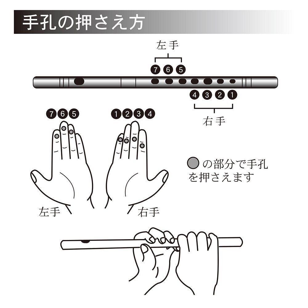 【音を鳴らすポイント】慣れない姿勢で篠笛を構えていると、ふさいでいると思っていても少し隙間が空いていることが原因で音が鳴らないことが多いです。