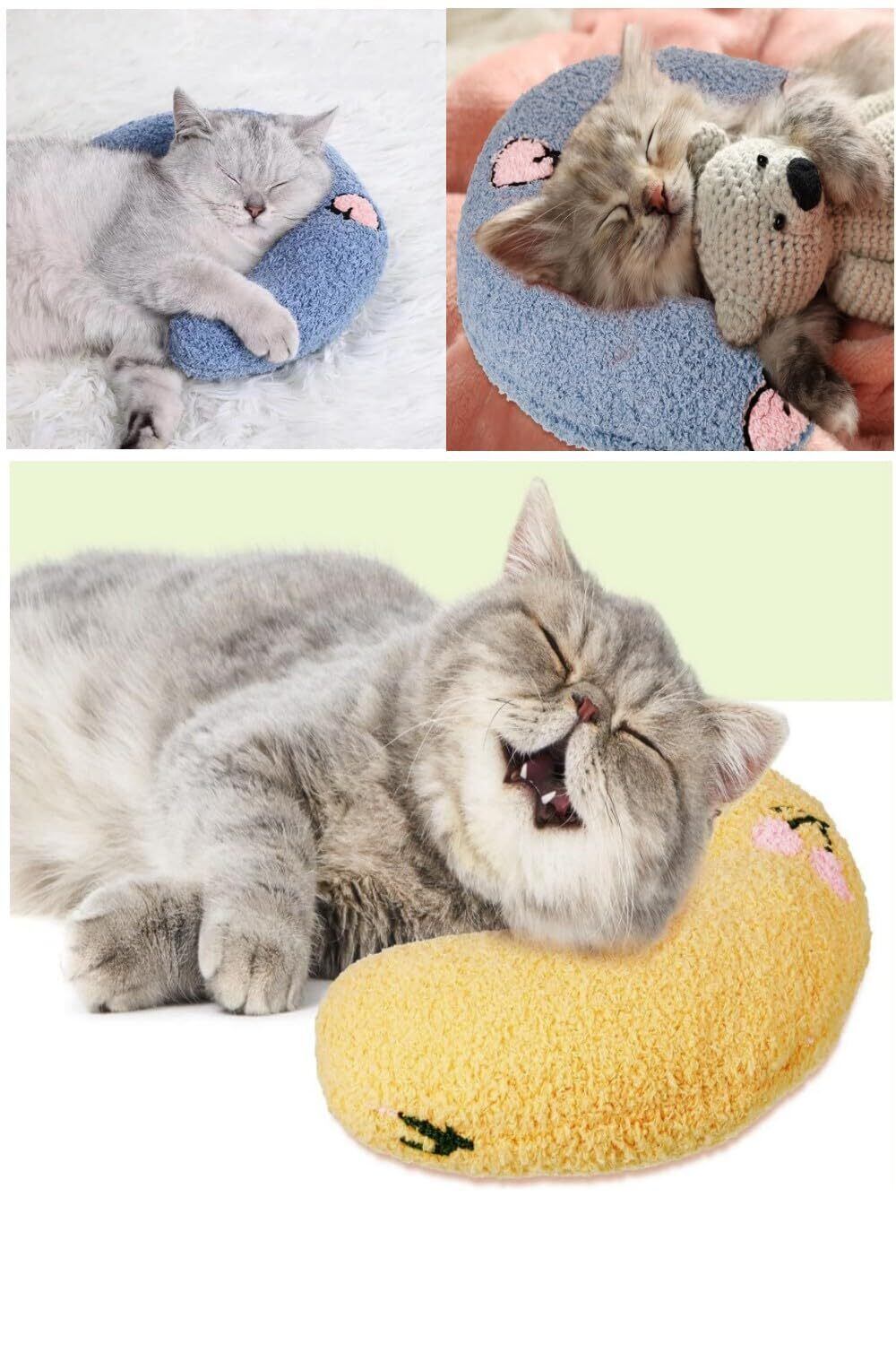【ペットを快適に眠らせる】フルーツの装飾が施された月形枕は、両面に使えます。寝ているときにペットに頸椎を保護させます。愛猫をリラックスさせ、枕の上で快適に眠ることができます。