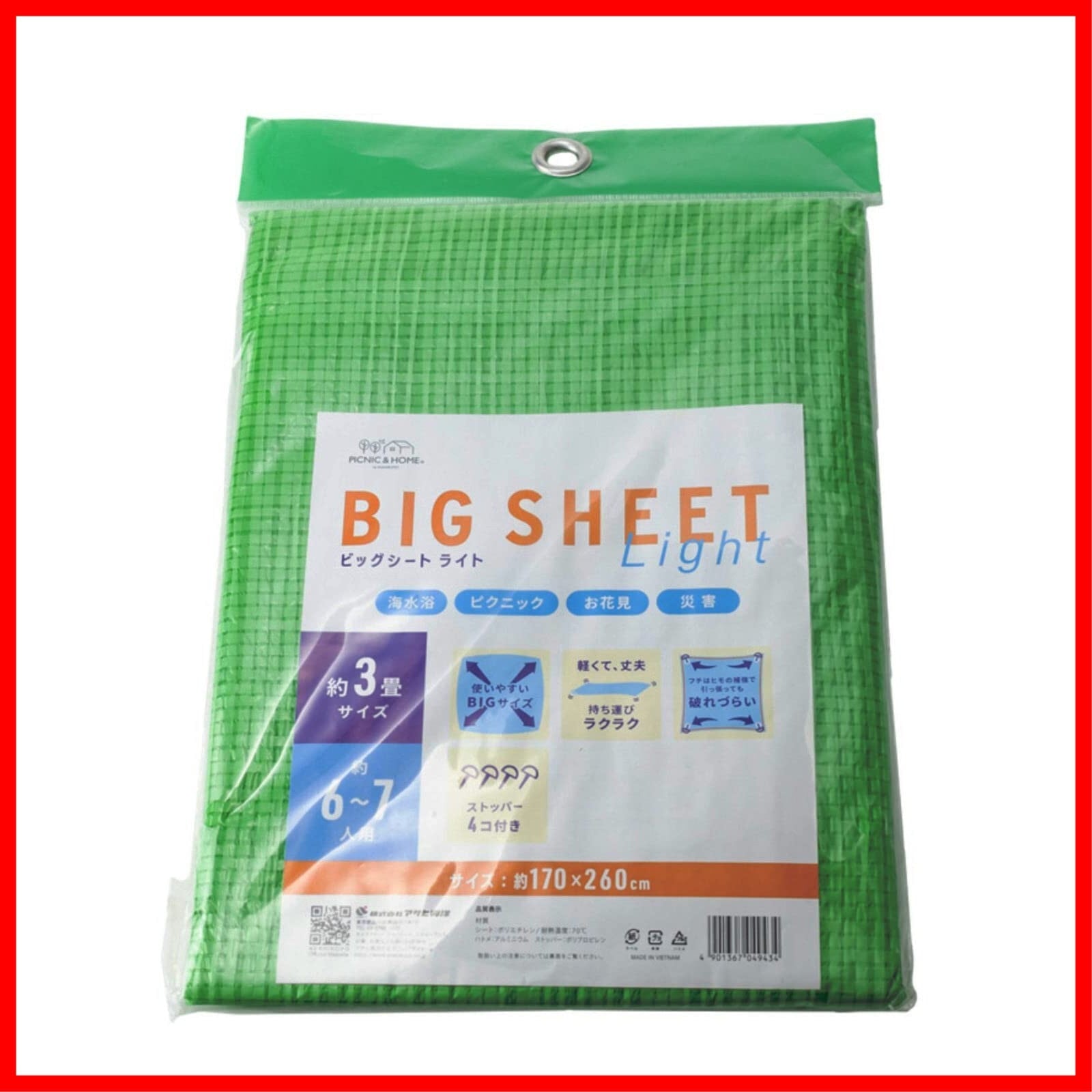 アサヒ興洋 レジャーシート 6~7人用 3畳 グリーン ストッパーピン付き 軽量 丈夫 破れにくい 持ち運び 携帯 海水浴 ピクニック お花見 災害 ビッグシートライト 1枚入