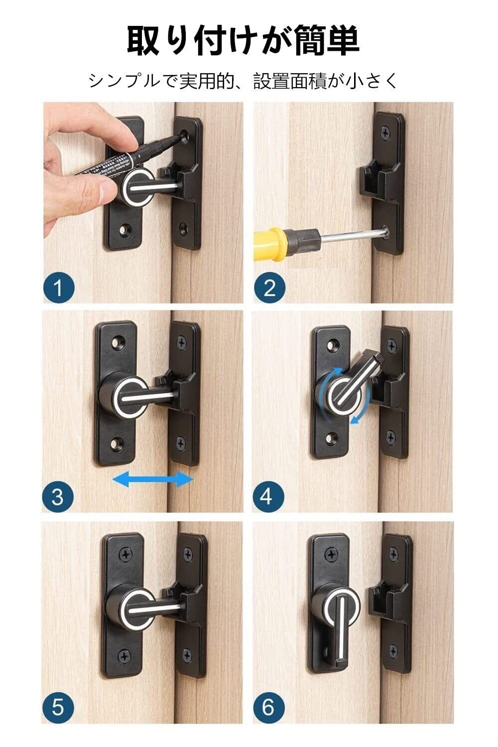 【取付けも簡単】取り付け用のネジが付属しているため、留め具をすぐに設置する事ができます。左または右にインストールすることを選択できます。特殊タイプで90度の角度で取り付けられるため、ドアや窓の安全を確保するために使用できます。