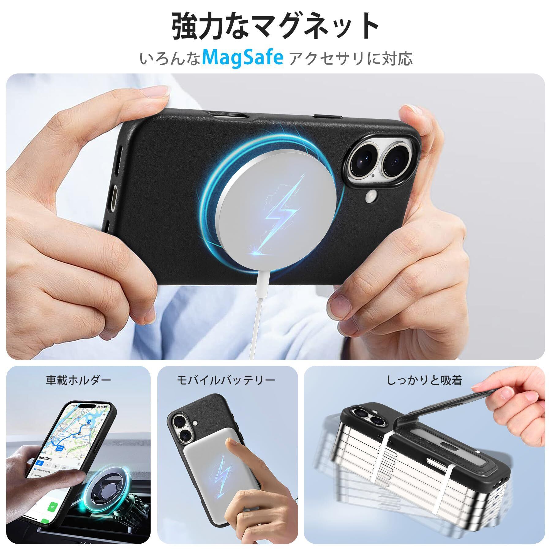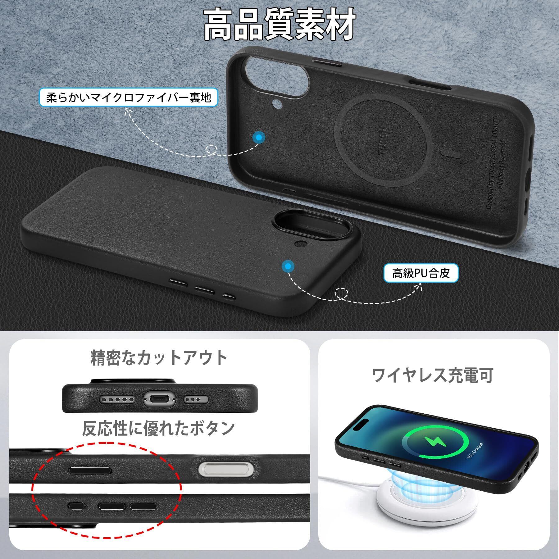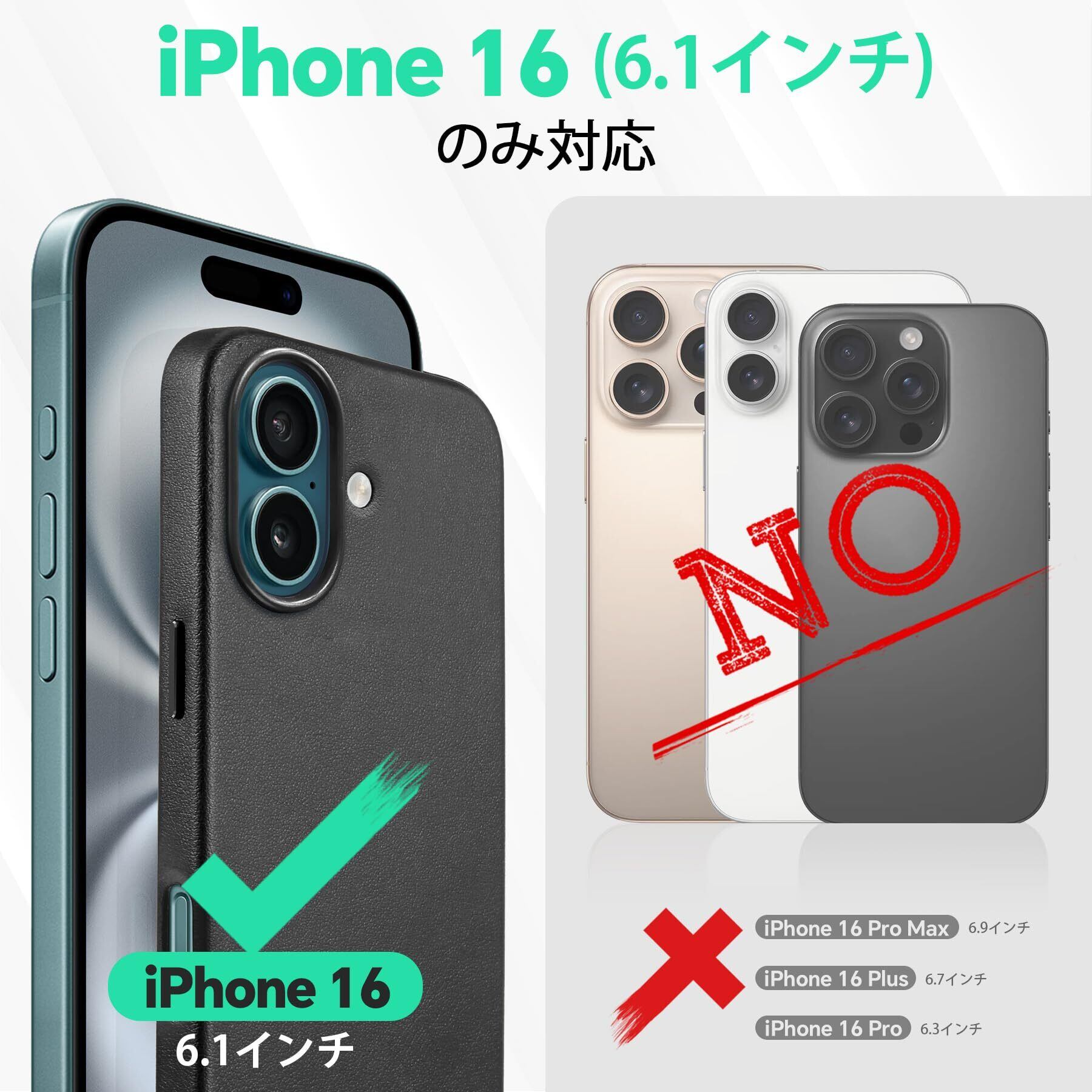 【細部までのこだわれ】①背面は品質よいPU合皮を採用して、耐久性がよくて、指紋が止め同時に手触りもいいです。②アイフォン16ケースの裏地には柔らかいな素材を採用され、着脱時携帯へのスレ傷を防止します。 ③ディスプレイやカメラレンズを効果的に保護するために、フチを高く設計しています、カメラレンズへのスレ傷を防止いたします。