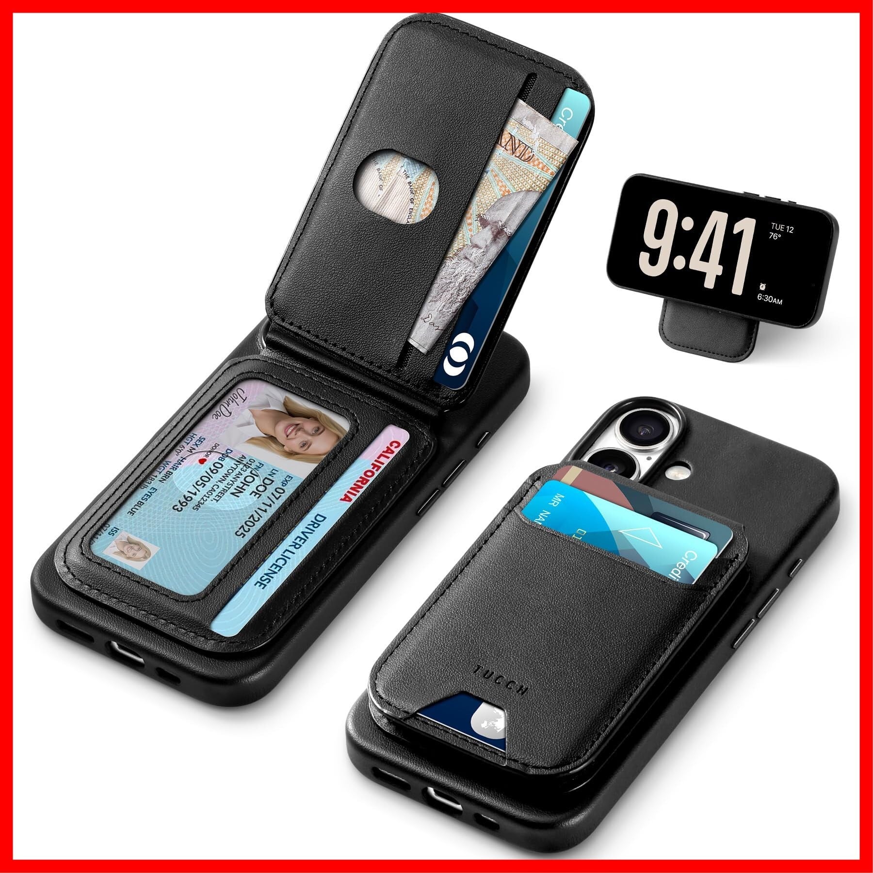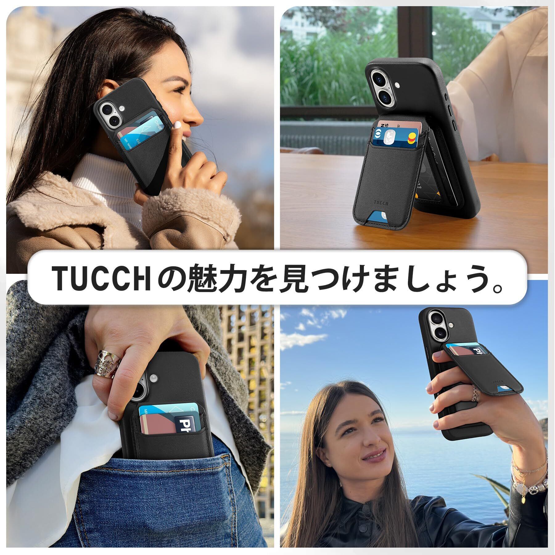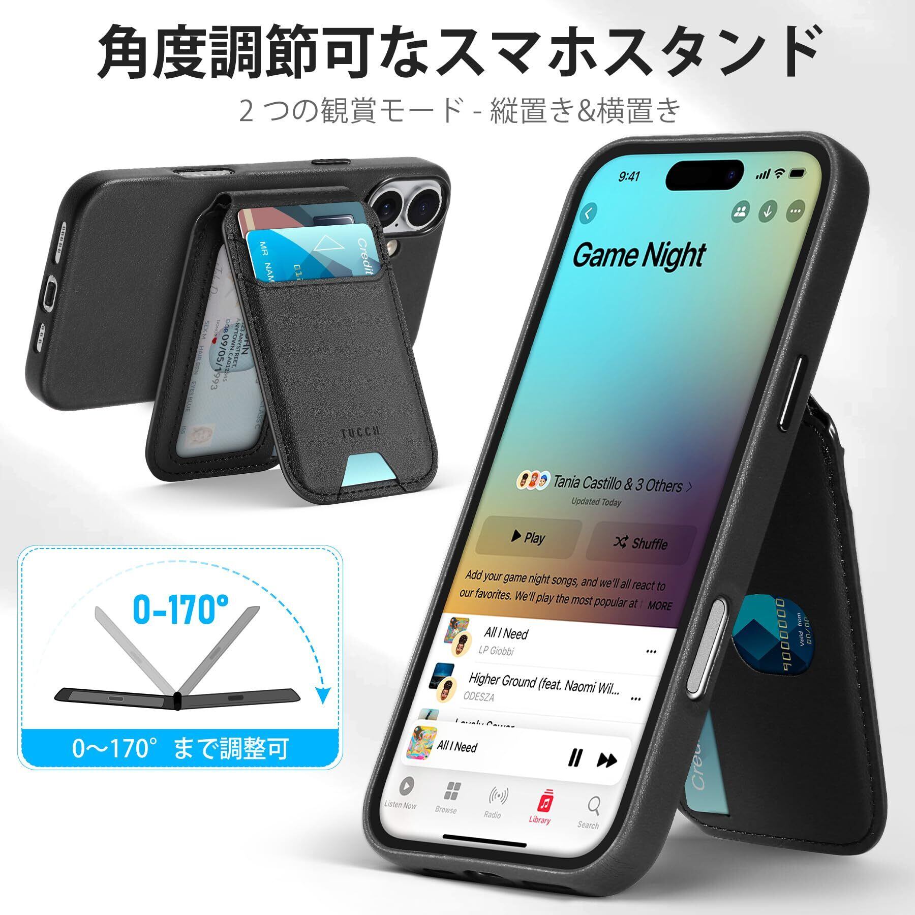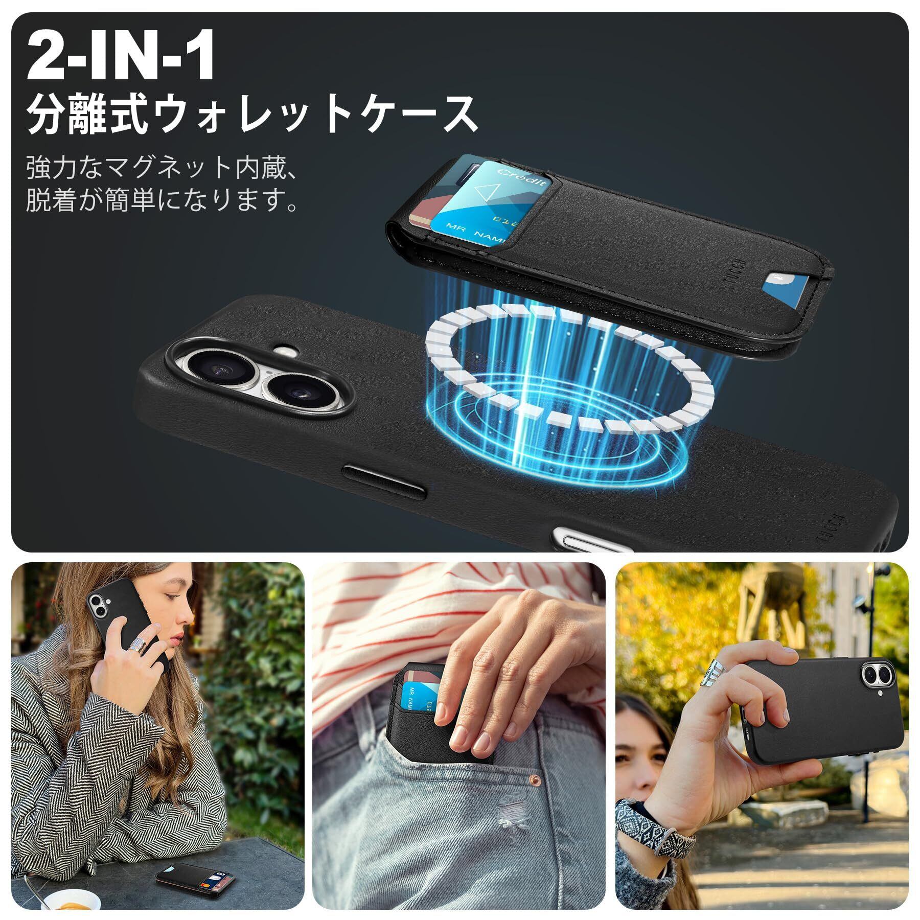 TUCCH iPhone16 対応 ケース PUレザー 折畳式カードケース付き あいふぉん16カバー 背面カード収納 軽量 薄型 取り外し可能 磁気吸着 ワイヤレス充電 [RFIDブロッキング] 横置きスタンド機能 PU合皮 アイフォン16携帯カバー (2024年発売 あいふぉん16 6.1インチ 対応) ブラック