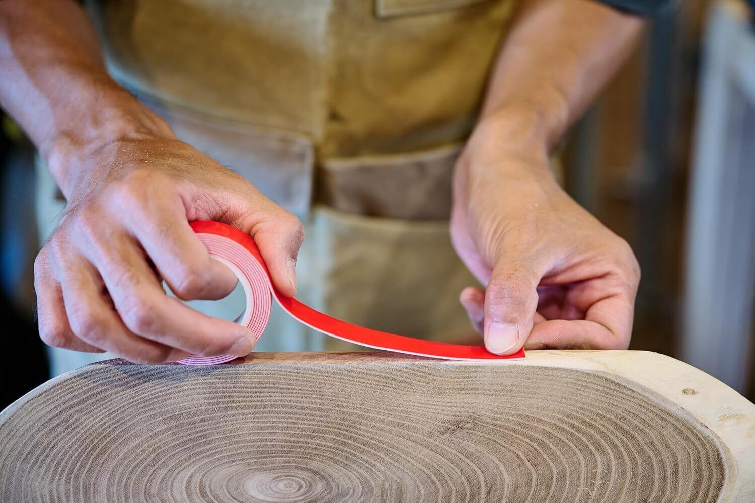 2. 表面の保護ラベルをはがし、接着したい場所に接着物を貼り合わせます。その後数秒しっかりと接着物を押してテープに圧力を与えます。
