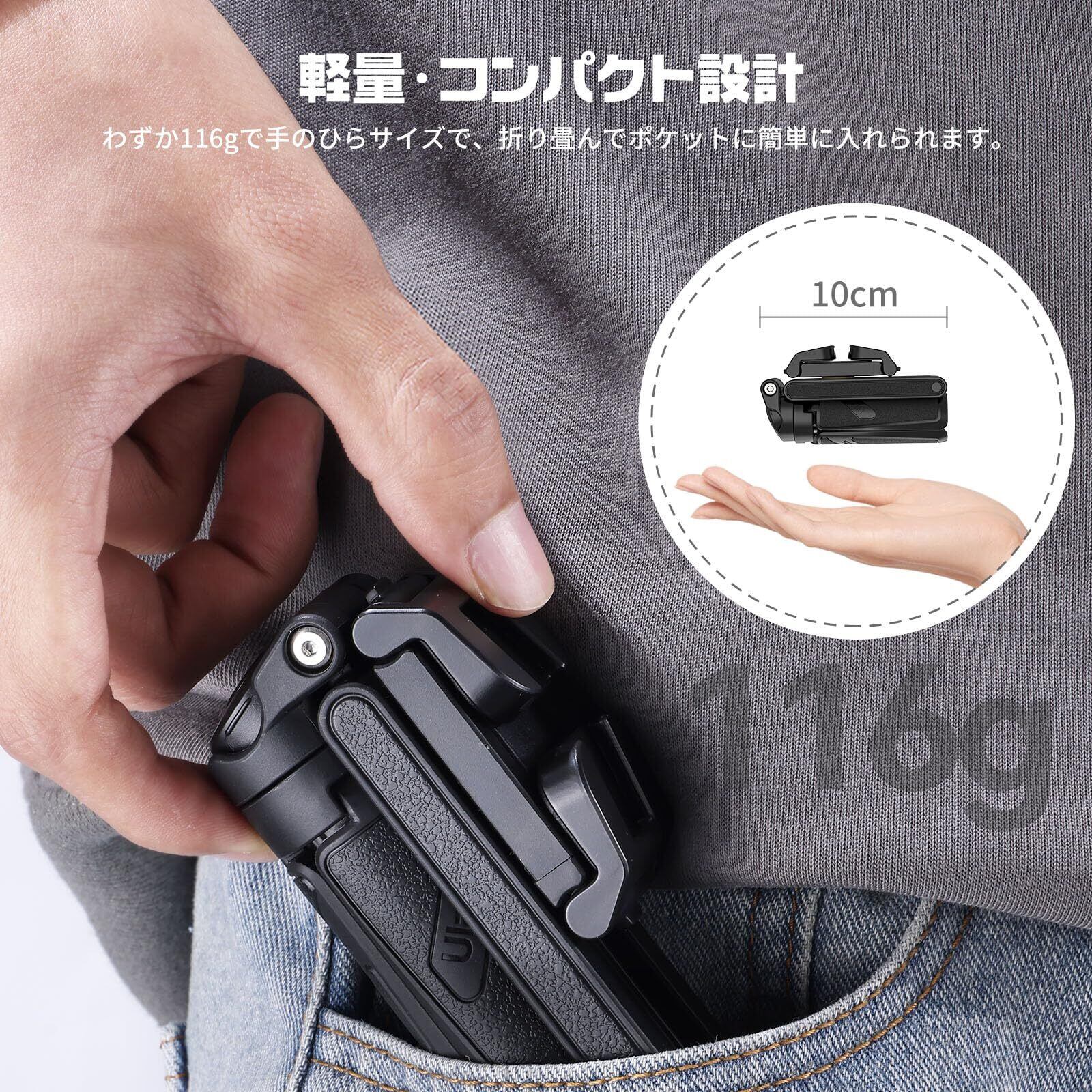 【超コンパクト・4 in 1スマホ三脚】Ulanzi 2024年新発売された多機能スマホ三脚です。一体型デザインにより、これ1つでカメラグリップ、自撮り棒、ミニ三脚、スマホスタンドとして使用でき、様々な撮影シナリオに合わせて自由に変換して使用できます。わずか116g、10cmの超軽量コンパクトなサイズで、カバンやポケットに簡単に入れ持ち歩けて、とても使いやすいです。